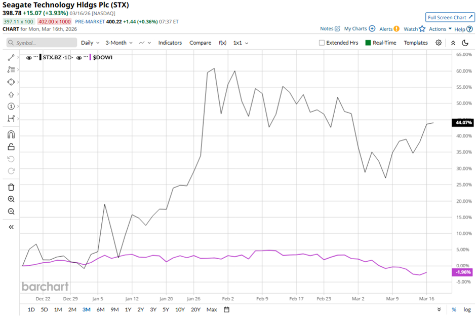 With a market cap of around $87 billion, Seagate Technology Holdings plc (STX) is a global provider of data storage technology and infrastructure solutions, operating across Singapore, the United States, the Netherlands, and other international markets. The company specializes in mass-capacity storage products such as enterprise hard drives, solid-state drives, and external storage solutions for consumers and businesses. Companies valued at $10 billion or more are generally labeled as “large-cap” stocks, and Seagate Technology fits this criterion perfectly. It also offers advanced platforms like Lyve to support edge-to-cloud data storage needs. What Options Traders Expect from Micron Stock After Earnings on March 18 This Dividend King With a 54-Year Dividend Streak Is Down 13% YTD. Time to Buy the Dip? Stocks Set to Open Higher as Bond Yields Fall, Fed Meeting and Middle East Conflict in Focus Stop Missing Market Moves: Get the FREE Barchart Brief – your midday dose of stock movers, trending sectors, and actionable trade ideas, delivered right to your inbox. Sign Up Now! Shares of the Singapore-based company have fallen 13.3% from its 52-week high of $459.84. STX stock has increased 38.4% over the past three months, surpassing the broader Dow Jones Industrials Average's ($DOWI) 2.4% drop over the same time frame. STX stock is up 44.8% on a YTD basis, outpacing Dow Jones' 2.3% decrease. longer term, shares of the company have climbed 353.7% over the past 52 weeks, compared to DOWI’s 13.2% return over the same time frame. The stock has been trading above its 50-day and 200-day moving averages since May 2025. Shares of Seagate Technology surged 19.1% following its fiscal Q2 2026 results on Jan. 27, significantly beating expectations, with revenue rising to $2.83 billion (up from $2.33 billion year-over-year) and adjusted EPS jumping to $3.11 (from $2.03), alongside a record 42.2% adjusted gross margin. Additionally, bullish forward guidance, projecting Q3 revenue of ~$2.9 billion and adjusted EPS of ~$3.40, combined with momentum in AI-driven storage demand and HAMR-based Mozaic products. In comparison, rival Everpure, Inc. (PSTG) has lagged behind STX stock. PSTG stock has declined 6.2% on a YTD basis and soared 23.4% over the past 52 weeks. Due to STX’s outperformance, analysts remain strongly optimistic about its prospects. Among the 24 analysts covering the stock, there is a consensus rating of “Strong Buy,” and the mean price target of $466.91 suggests a premium of 17.1% to current levels. On the date of publication, Sohini Mondal did not have (either directly or indirectly) positions in any of the securities mentioned in this article. All information and data in this article is solely for informational purposes. This article was originally published on Barchart.com