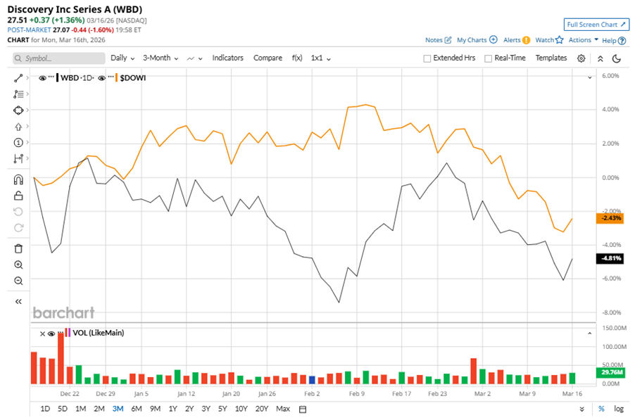 New York-based Warner Bros. Discovery, Inc. (WBD) operates as a media and entertainment company worldwide. With a market cap of $67.3 billion, the company offers a complete portfolio of content, brands, and franchises across television, film, streaming, and gaming. Companies worth $10 billion or more are generally described as “large-cap stocks,” and WBD perfectly fits that description, with its market cap exceeding this mark, underscoring its size, influence, and dominance within the entertainment industry. WBD's strengths include iconic brands (Warner Bros., HBO, CNN), diverse content, and global distribution in 220+ countries. Its tech investments in AI, cloud, and cybersecurity boost its edge. What Options Traders Expect from Micron Stock After Earnings on March 18 This Dividend King With a 54-Year Dividend Streak Is Down 13% YTD. Time to Buy the Dip? Stocks Set to Open Higher as Bond Yields Fall, Fed Meeting and Middle East Conflict in Focus Markets move fast. Keep up by reading our FREE midday Barchart Brief newsletter for exclusive charts, analysis, and headlines. Despite its notable strength, WBD slipped 8.3% from its 52-week high of $30, achieved on Dec. 12, 2025. Over the past three months, WBD stock has declined 4.8%, underperforming the Dow Jones Industrials Average’s ($DOWI) 2.4% dip during the same time frame. Shares of WBD rose 50.7% on a six-month basis and climbed 170% over the past 52 weeks, significantly outperforming DOWI’s six-month gains of 2.6% and solid 13.2% returns over the last year. To confirm the bullish trend, WBD has been trading above its 200-day moving average since late May, 2025. However, the stock has been trading below its 50-day moving average since late February. On Feb. 26, WBD shares closed down marginally after reporting its Q4 results. Its loss of $0.10 per share fell short of Wall Street expectations of EPS of $0.02. The company’s revenue was $9.5 billion, meeting Wall Street forecasts. In the competitive arena of entertainment, Paramount Skydance Corporation (PSKY) has lagged behind WBD, with a 45.8% downtick over the past six months and 18.7% losses over the past 52 weeks. Wall Street analysts are cautious on WBD’s prospects. The stock has a consensus “Hold” rating from the 23 analysts covering it, and the mean price target of $29.03 suggests a potential upside of 5.5% from current price levels. On the date of publication, Neha Panjwani did not have (either directly or indirectly) positions in any of the securities mentioned in this article. All information and data in this article is solely for informational purposes. This article was originally published on Barchart.com