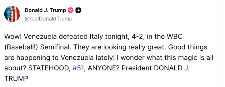 Donald Trump raised eyebrows and drew ridicule with a post suggesting Venezuela could become the 51st U.S. state. After Venezuela defeated Italy 4–2 in the World Baseball Classic semifinal on Monday, the president wrote on his Truth Social platform: “Wow! Venezuela defeated Italy tonight, 4-2, in the WBC (Baseball!) Semifinal. They are looking really great. Good things are happening to Venezuela lately! I wonder what this magic is all about? STATEHOOD, #51, ANYONE?” Trump has previously floated similar ideas about somehow making Greenland and Canada part of the United States. A U.S. military operation in January saw Venezuelan President Nicolás Maduro seized from his home and taken to the United States, where he remains in custody in New York facing cocaine-trafficking conspiracy charges. Venezuela is set to face the United States in the World Baseball Classic final in Miami on Tuesday. Trump:Me me me me me meOnly me me me Me me me me me me Only me me me Me me me me me meOnly me me me Me me me me me me Only me me me Would this immediately make all Venezuelans US citizens? If Canada had won in Olympic Hockey would Trump be talking about annexing them now too? Trump is just playing mind games... Venezuela will never, ever become the 51st state...There are too many multiracial people or people of color in their country and Spanish is their official language 🤣 😂 ... -DW https://t.co/PgJnqi7Xpk Imagine if this madman had access to the United State’s Nuclear Codes. 😳 Wait until Venezuela beats the fuck out of American in the final. Then it will be a:"Rigged Game By Venezuela. Who I Love and Only Want the Best Regime Change For. Venezuela Should Share Their Prize With USA as a Protector and Regime Changer. Best In The History Of The World!" Delusional. Venezuela is a sovereign nation, not a potential 51st state. Stick to golf and leave the geopolitical magic to the experts. Annexing a country over a baseball game is a new level of unhinged. 🤡 You are telling me if Puerto Rico would have made it to the final they would have gotten statehood? Jesus, can’t he let us have anything without him? So make all the Venezuelans citizens? His White Nationalist base will love that He is really decompensating. He is so embarrassing... Little piggy narcissist needs attention 24/7 We’re gonna have like 60 states by the time he’s done It didn't work with Canada, it didn't work with Greenland...it ain't gonna work with Venezuela.Trump is a deranged, senile jackass. Just mindlessly shouting into the void, expecting to get what he wants.He should get what he deserves: impeachment, then prison. Fuck Trump. 🖕 That would be ridiculous considering how far away Venezuela is. And that should be up to the Venezuelan people. Yeah, after deporting so many Venezuelans. Trump on Venezuela: "STATEHOOD, #51, ANYONE?" pic.twitter.com/OJ61prHFnq By entering your email and clicking Sign Up, you're agreeing to let us send you customized marketing messages about us and our advertising partners. You are also agreeing to our Terms of Service and Privacy Policy.