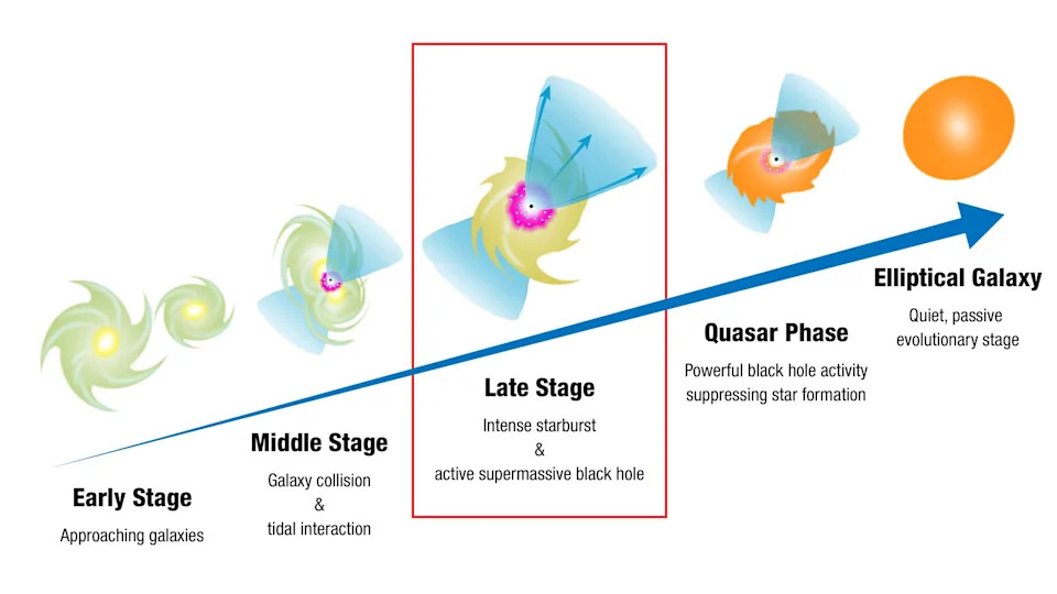 Thus, the "switching on" of this supermassive black hole's powerful outflows could help scientists better understand how these cosmic titans and the intense winds of matter that flow from them influence their home galaxies, and how galaxies and their incumbent and dominant central supermassive black holes evolve in unison.