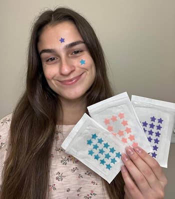 Promising review: "I LOVE the look of pimple patches on myself (as weird as that sounds) and absolutely hate the semi-clear ones, since they just draw my eyes to something that’s SUPPOSED to be invisible. So I easily fell in love with the Starface pimple patches — but the issue with those is they’re SO expensive and don’t work at all. THESE, however, have immediately sucked everything out of my face. I love them and literally wear them all the time. So many people have complimented me, saying, 'Oh my gosh, I love how you just wear stickers on your face; it’s adorable.' These also work as an alternative to the TikTok Shop ones that are really popular right now and are cheaper! 10/10 from me :)" —evalyn evoke