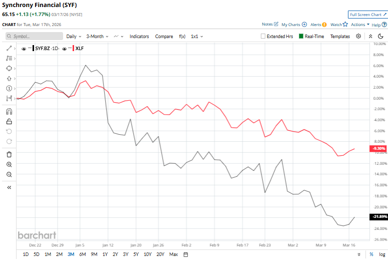 Synchrony Financial (SYF) is a leading Stamford, Connecticut-based consumer financial services company specializing in private-label credit cards, installment financing, and consumer lending, primarily through partnerships with retailers, healthcare providers, and digital platforms. With a market cap of $30.5 billion, the company firmly qualifies as a large-cap, well above the $10 billion benchmark, and leverages this scale to deliver extensive credit solutions across a broad network of major retailers and service partners. However, the stock has fallen 26.6% below its 52-week high of $88.77 touched on Jan. 9. Moreover, over the past three months, SYF has tanked 21.7%, trailing the State Street Financial Select Sector SPDR ETF’s (XLF) 9.3% drop during the same stretch. As Oracle Reveals Higher Restructuring Costs, Should You Still Buy ORCL Stock or Stay Far Away? Stop Fighting Time Decay: How Credit Spreads Change the Game for Options Traders Stocks Climb on Strength in Chip and Travel Stocks Markets move fast. Keep up by reading our FREE midday Barchart Brief newsletter for exclusive charts, analysis, and headlines. The stock has climbed 21.9% over the past 52 weeks and has plunged 12.9% over the past six months, whereas XLF gained marginally over 52 weeks and dipped 8.4% over the past six months. SYF stock has slipped below its 50-day and 200-day moving averages since mid-Jan and the end of February, respectively, indicating a downtrend. Shares of Synchrony Financial dropped 7.1% on Feb. 27, as investor sentiment weakened due to rising macro and sector-specific concerns. The decline was triggered by fears that increased adoption of artificial intelligence, highlighted by workforce cuts at Block, could hurt employment and, in turn, consumer credit health. Additional pressure came from stronger-than-expected inflation data, reinforcing concerns about prolonged high interest rates, along with growing anxiety around credit quality and rising problem loans, prompting investors to reassess risk across credit-sensitive financial stocks. Synchrony Financial has demonstrated far stronger resilience than its peer SLM Corporation (SLM), which has tanked 32.2% over the past year and nearly 30% in the last six months. This relative outperformance is reflected in analyst sentiment as well, with 24 analysts assigning a “Moderate Buy” consensus rating and an average price target of $88.33, suggesting a potential upside of 35.6% from current levels. On the date of publication, Kritika Sarmah did not have (either directly or indirectly) positions in any of the securities mentioned in this article. All information and data in this article is solely for informational purposes. This article was originally published on Barchart.com