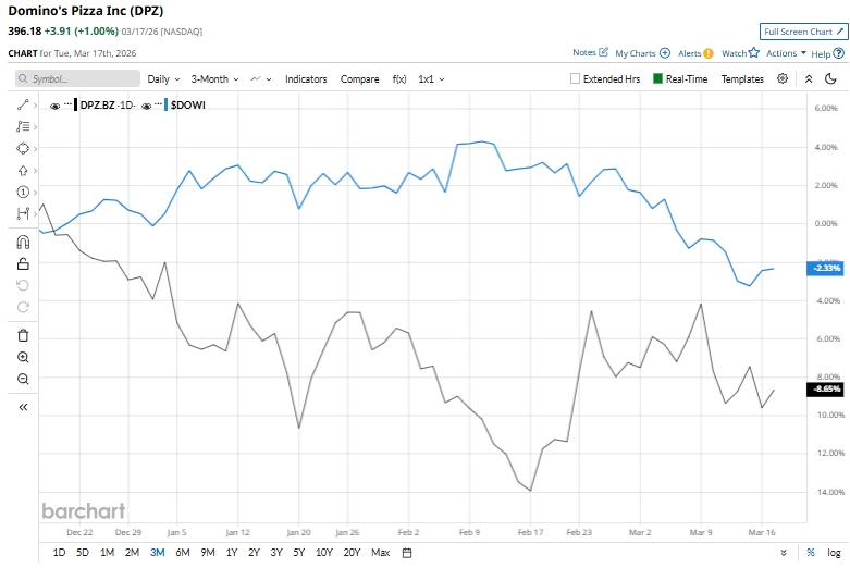 Headquartered in Ann Arbor, Domino's Pizza, Inc. (DPZ) is a global quick-service restaurant leader that operates a predominantly franchise-based model, generating revenue through royalties, franchise fees, and its vertically integrated supply chain. The company commands a market cap of $13.2 billion, securing its place in the “large-cap” arena, a territory reserved for companies valued above $10 billion. With a presence in over 90 countries and a strong focus on digital ordering and delivery efficiency, the company has positioned itself as a technology-driven food delivery platform. As Oracle Reveals Higher Restructuring Costs, Should You Still Buy ORCL Stock or Stay Far Away? Stop Fighting Time Decay: How Credit Spreads Change the Game for Options Traders Stocks Climb on Strength in Chip and Travel Stocks Tired of missing midday reversals? The FREE Barchart Brief newsletter keeps you in the know. Sign up now! Despite the notable feat, it is currently trading 20.6% below its 52-week high of $499.08. The stock has dropped 9.6% over the last three months, underperforming the Dow Jones Industrial Average’s ($DOWI) 2% decline during the same time frame. Even long-term figures echo this softness. DPZ stock has plunged 11.9% over the past 52 weeks and 9.6% over the past six months, far behind the Dow Jones Industrial Average’s 13% and 1.8% gains, respectively. Domino’s has been trading below its 200-day moving average since mid-September and has recently slipped below its 50-day moving average, reinforcing a bearish trend. On Feb. 23, Domino’s Pizza released its Q4 FY2025 results, sending its shares up 4.1% as investors reacted positively to strong top-line performance and steady global expansion. The company reported revenue of $1.54 billion, up 6.4% year over year, with operating income rising 8% to $295.7 million and net income rising 7.2% to $181.6 million. While its EPS of $5.35 slightly missed expectations, underlying business momentum remained solid, supported by 4.9% global retail sales growth, including a 3.7% increase in U.S. same-store sales. Domino’s also added approximately 392 net new stores during the quarter, reinforcing its expansion strategy. DPZ’s top rival Arcos Dorados Holdings Inc. (ARCO) plunged 6.5% over 52 weeks but gained 16.1% over the past six months, outpacing DPZ. Among 30 analysts, the consensus rating stands at a “Moderate Buy,” and the average price target of $482.24 signals 21.7% potential upside from current levels. On the date of publication, Kritika Sarmah did not have (either directly or indirectly) positions in any of the securities mentioned in this article. All information and data in this article is solely for informational purposes. This article was originally published on Barchart.com