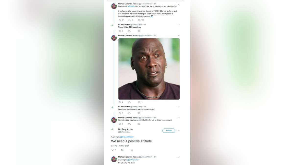 Fox News Flash top sports headlines are here. Check out what's clicking on FoxNews.com. While it seems like a distant, all but forgotten memory, politicians and top public health officials were outrageously, prolifically ridiculous throughout the COVID lockdown era of 2020. They were relentless in lecturing the public, demanding compliance with absurd mandates, often while refusing to comply with those mandates themselves, and ignoring when science and data proved them wrong. There was a concerted effort to demonize anyone who refused to panic and continue with their daily lives and maintain a semblance of normalcy. Those who correctly assessed that masks did not work were labeled "grandma killers." People who pushed for the return of sports were considered "irresponsible" and "selfish." Those who complained about their freedoms and liberties being infringed upon were dismissively referred to as "free-dumb lovers." CLICK HERE FOR MORE SPORTS COVERAGE ON FOXNEWS.COM In a sane world, those who engaged in such embarrassing, humiliating, discrediting anti-science behavior, and prolific disregard for reality would have no possibility of somehow being promoted. But if you need more proof we do not live in a sane world, look no further than Dr. Amy Acton, the former top public health official in Ohio and current Democratic Party Gubernatorial candidate in the state. Because she perfectly exemplifies the disastrous failure of our politicians and "experts" in the COVID era. Ohio gubernatorial hopeful Amy Acton. (© Jason J. Molyet/News Journal / USA TODAY NETWORK via Imagn Images) OutKick exclusively obtained a series of social media posts that appear to be made by Dr. Acton's Twitter account in May 2020, engaging primarily with fans of the Cleveland Browns. These posts, which have since been deleted, highlight Acton's comical level of commitment to pointless COVID restrictions. In one example, she responded to a Browns fan posting a Kermit meme about their hopes for the team to make the playoffs by saying, "Please social distance." In another, a Browns fan posted about Baker Mayfield as the team's quarterback, only for Acton to respond with "Please follow CDC guidelines." That fan then responded with a photo, to which she added, "We should be discussing ways to prevent covid." Incredible stuff, considering there is no way to "prevent COVID." Another post was simply a photo of the Browns punter lifting a log, to which she added, again, "Please social distance." One fan responded to that Browns Twitter was the only "fun part of quarantine." This was apparently too much for Acton, who responded with "Please stop." Some other fan discussion was interrupted with Acton adding "We are in a pandemic." In a continuation of another thread, she responded to a meme by saying, "Grow up #StayAtHome." One fan posted about their hopes for the team to make the Super Bowl, and Acton incredibly added, "No. Too many people." Amazing. For some reason, she also interjected herself into a conversation by saying, "We need masks and ppe, not jerseys." Spoiler alert: we did not need masks. BROWNS' NFL RULE PROPOSAL ON FUTURE DRAFT PICKS IN TRADES DRAWS SCRUTINY These posts are, like so much of Acton's public health "guidance," utterly disqualifying. They're also extremely bizarre. Why was Acton even inserting herself into conversations about the Cleveland Browns? Causing economic destruction with ridiculous lockdowns, ruining lives and livelihoods…that wasn't enough? She had to target people who were trying to find some semblance of normalcy, looking for positives and distractions through sports, with pointless hectoring and bizarre criticism? That's what she was spending her time on, while ironically chastising others for looking for positives while "in a pandemic?" CLICK HERE TO GET THE FOX NEWS APP OutKick reached out to Acton to ask why she made these posts, to explain her "thinking" and rationale. As of time of publishing, we had not received a response. The fact Acton has the support she does indicates that there will never be accountability for those who made these decisions, who put their political ideology ahead of facts, science, data and evidence. There should be. Follow Fox News Digital’s sports coverage on X, and subscribe to the Fox News Sports Huddle newsletter. Get all the stories you need-to-know from the most powerful name in news delivered first thing every morning to your inbox Subscribed You've successfully subscribed to this newsletter!
