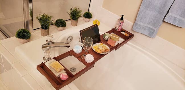 Not only is it size adjustable to accommodate different tubs, it comes equipped with a wineglass holder, edges that safely prop up a book or tablet, a candleholder, and extra space for whatever else their cozy heart desires.