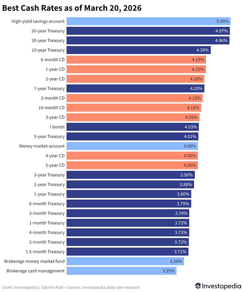 With the Federal Reserve holding rates steady, safe places to keep savings are still offering stronger returns than many expect. Top savings accounts, CDs, brokerage cash accounts, and Treasurys pay 3%–5% with almost no risk—some with guaranteed returns. Our weekly chart lets you quickly compare all of today’s best cash yields in one place. The Federal Reserve held rates steady again this week—its second pause this year after three cuts last fall—helping keep cash yields elevated across savings accounts, CDs, brokerages, and Treasurys. Every week, we chart the best-paying options across the major cash categories—all in one place for easy comparison. The top high-yield savings accounts still pay up to 5.00% if you meet certain requirements, or around 4.50% for no-strings-attached accounts. Among CDs, the best nationwide rate is 4.25%, and brokerages, robo-advisors, and Treasurys continue to offer attractive returns in the mid-3% to upper-4% range. These yields make now an appealing time to put idle cash to work while rates remain elevated. Below, we’ll show how much you could earn on different balances and how the top yields stack up by product type. Inflation is currently about 2.4%, so savings should earn at least that much to avoid losing purchasing power. Today’s top cash options clear that bar by a wide margin. Even if you’re staying cautious amid market swings, keeping your cash sidelined doesn’t mean it has to sit idle. The right account can still turn short-term safety into meaningful earnings. With a lump-sum savings deposit of $10,000, $25,000, or even $50,000, you can earn hundreds of dollars in interest if you choose one of today’s top rates. Whether you opt for a 3.25% cash management account, a top high-yield savings or money market account paying 5.00%, or something in between, here’s what different balances could earn over the next six months. Six Months of Earnings at Various APYs APY Earnings on $10K for 6 months Earnings on $25K for 6 months Earnings on $50K for 6 months 3.25% $161 $403 $806 3.50% $173 $434 $867 3.75% $186 $464 $929 4.00% $198 $495 $990 4.25% $210 $526 $1,051 4.50% $223 $556 $1,113 4.75% $235 $587 $1,174 5.00% $247 $617 $1,235 The rate you earn from a savings account, money market account, cash account, or money market fund is variable and will generally drop whenever the Fed cuts rates. In contrast, CDs and Treasurys allow you to lock in your yield for a set period. For a low-risk return that’s still rewarding, today’s top cash options fall into three main categories—each with slightly different trade-offs that depend on how long you want to keep your funds parked. Bank and credit union products: Savings accounts, money market accounts (MMAs), and certificates of deposit (CDs) Brokerage and robo-advisor products: Money market funds and cash management accounts U.S. Treasury products: T-bills, notes, and bonds, plus inflation-protected I bonds You can choose a single option or mix and match based on your goals and timeline. Either way, knowing what each one pays is essential. Below, we break down the top rates in each category as of Friday’s market close and how they’ve changed since last week. The rates below represent the top nationally available annual percentage yields (APYs) from federally insured banks and credit unions, based on our daily analysis of more than 200 institutions offering products nationwide. The yield on money market funds fluctuates daily, while rates on cash management accounts are more fixed but can be adjusted at any time. Related: 6 Best Investment Accounts for Handling Uninvested Cash Treasury securities pay interest through maturity and can be purchased from TreasuryDirect or traded on the secondary market through a bank or brokerage. I bonds must be bought from TreasuryDirect and can be held for up to 30 years, with rates adjusted every six months. Every business day, Investopedia tracks rates from more than 200 banks and credit unions that offer CDs and savings accounts to customers nationwide and determines daily rankings of the top-paying accounts. To qualify for our lists, the institution must be federally insured (FDIC for banks, NCUA for credit unions), and the account’s minimum initial deposit must not exceed $25,000. It also cannot specify a maximum deposit amount that’s below $5,000. Banks must be available in at least 40 states to qualify as nationally available. And while some credit unions require you to donate to a specific charity or association to become a member if you don’t meet other eligibility criteria (e.g., you don’t live in a certain area or work in a certain kind of job), we leave out credit unions whose donation requirement is $40 or more. For more about how we choose the best rates, read our full methodology. Read the original article on Investopedia