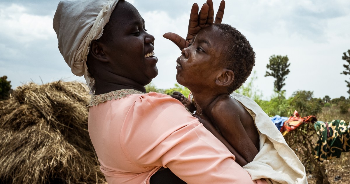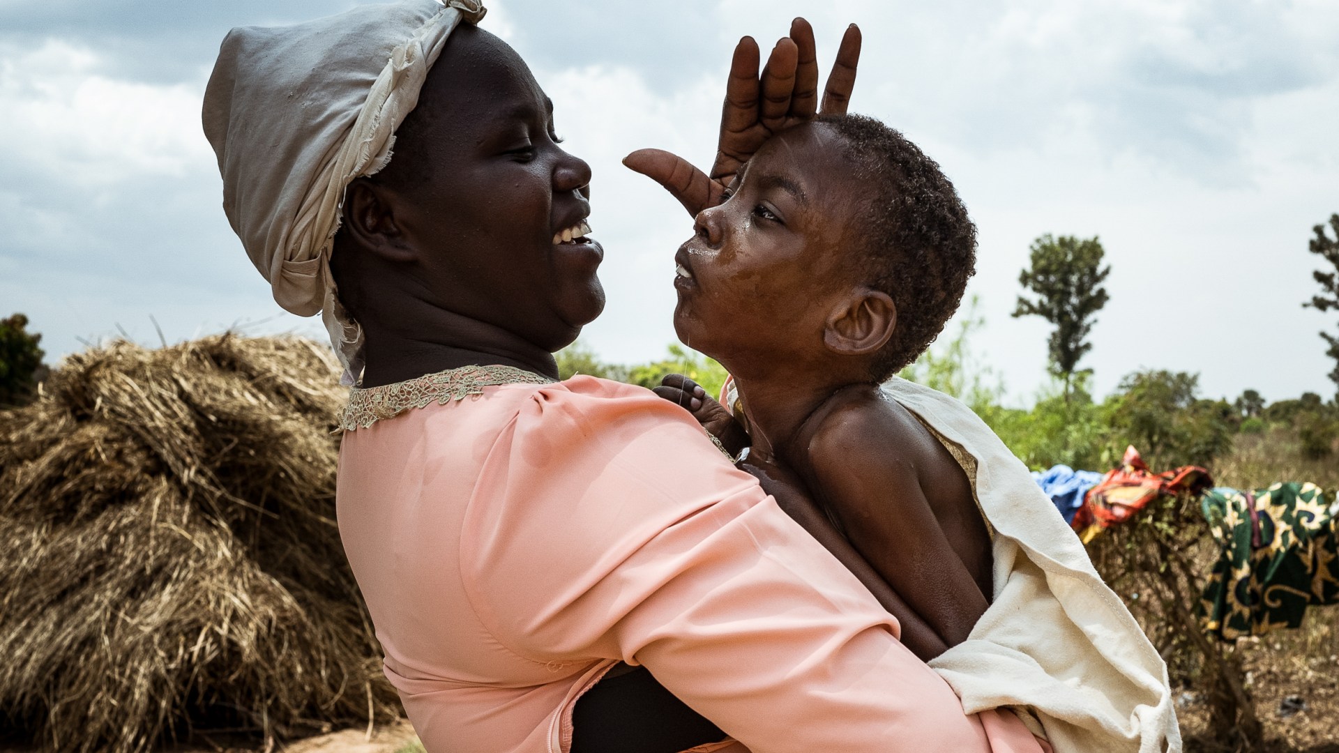After bathing Aaron outside in the early afternoon, she dries his bony frame with a towel as her family’s chickens and goats wander over. She sits on a mat on a patch of grass outside their hut, wraps him in the towel and holds him, her face beaming, before she pulls a T-shirt over his head and dresses him in clean pants. They play peekaboo, Aaron giggling and his eyes lighting up as she reappears.