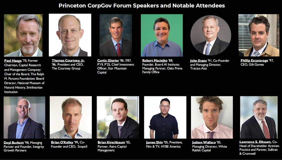 Watch Video Highlights from 1st Princeton CorpGov Forum Below, or Click HERE: CorpGov will host the second Princeton CorpGov Forum on Thursday, May 21, 2026, at The Nassau Inn in Princeton, New Jersey. The forum, hosted in The Prince William Ballroom, will feature an afternoon of panels, firesides and networking, followed by a reception with cocktails and heavy hors d’oeuvres. REGISTER HERE Agenda – The Prince William Ballroom: 2pm – Registration and networking 3pm – Panels begin 6pm – Cocktail reception Panel Topics Include: Governance: Various Stakeholder Perspectives Endowment Investments Capital Markets: Private Equity and IPOs Cybersecurity and AI as Boardroom Issues The Business of Sports and Media The event will be digitized into a report published on CorpGov and content partners Yahoo Finance, Bloomberg Terminals, Reuters via LSEG Workspace, and AlphaSense, filmed in 4K with professional editing. We invite institutional investors, corporate executives, and Princeton alumni/students to attend the event. For information on being a speaker, please email Editor@CorpGov.com. The first Princeton CorpGov Forum was hosted together with The New York Stock Exchange and Goldman Sachs, held on May 22, 2025, at The Nassau Inn in Princeton, New Jersey. Speakers and Notable Attendees at the Second Princeton CorpGov Forum Paul Haaga ’70, Former Chairman, Capital Research and Management Company; Chair of the Board, The Ralph M. Parsons Foundation; Board Director, National Museum of Natural History, Smithsonian Institution Thomas Courtney, Jr. ’86, President and CEO, The Courtney Group Curtis Glovier ’86, S’87, P’19, P’25, Chief Investment Officer, Star Mountain Capital Robert Maciejko ’88, Founder, Board AI Institute; Managing Partner, Oaks Prime Family Office John Evans ’91, Co-Founder and Managing Director, Tractus Asia Phillip Escaravage ’97, CEO, Gift Games Doyl Burkett ’98, Managing Partner and Founder, Integrity Growth Partners Brian O’Kelley ’99, Co-Founder and CEO, Scope3 Brian Kirschbaum ’02, Partner, Astra Capital Management James Shin ’05, President, Film & TV, HYBE America Judson Wallace ’05, Managing Director, White Rabbit Capital Lawrence S. Elbaum, Co-Head of Shareholder Activism Practice and Partner, Sullivan & Cromwell LLP Rafique Jiwani, Vice President, Goldman Sachs Private Equity Andy Katz, General Partner, BrknPar Ventures (Sport Tech Growth Equity Fund) Ryan Keating, Partner, Eisner Advisory Group Tad Nacheff, Head of East Coast Capital Markets and Financial Sponsor Coverage, NYSE David Schulhof, Founder and CEO, MUSQ Global Music Industry ETF (NYSE: MUSQ) Karen Snow, CEO, Rose & Co. Capital Advisors; Former Global Head of Listings, Nasdaq Zach Swartz, Partner, Real Estate Capital Markets and Mergers & Acquisitions, Vinson & Elkins LLP Ken Traub, Chairman, President and CEO, Comtech Telecommunications Corp. (Nasdaq: CMTL) Dan Zacchei, Managing Partner, Longacre Square Partners John Jannarone ’03, CEO, CorpGov (Moderator) Jarrett Banks, COO, CorpGov (Moderator) John G. Quigley, Co-Founder and former Managing Partner, Nassau Capital, established in the mid-90s as the exclusive manager of the Princeton endowment’s alternative assets (Moderator) Watch Princeton in Palm Beach Highlights Below, or Click HERE: Princeton alumni also gathered at the Palm Beach Yacht Club on Dec. 23, 2025, to toast the holiday season and the 2nd Annual Princeton CorpGov Forum, scheduled during 2026 Reunions. More details HERE. Clockwise from left: Christopher Sanson ’02, Amy Gold ’02, Hannah Baumann ’18, Adithya Sriram ’24, Mary Allen Saunders ’02, Amy Gold ’02, Bruce Burlen ’79, Kate Brooks k’79, Cathy Morra ’77, Richard Rampell ’74 READ MORE Save the Date: 2nd LA CorpGov Forum Sep 18 Featuring Sports, Entertainment & M&A Register for our weekly newsletter HERE Contact: CorpGov.com Editor@CorpGov.com Click HERE to follow us on LinkedIn The post 2nd Princeton CorpGov Forum Preliminary Speakers for May 21 appeared first on CorpGov.