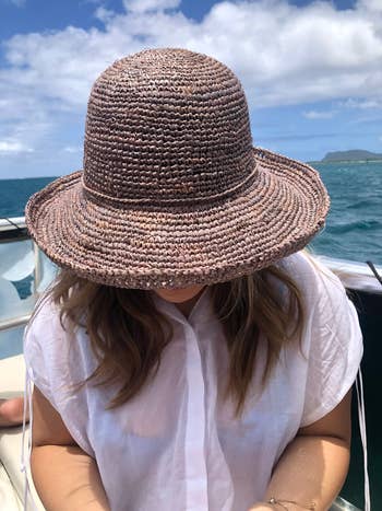 Promising review: "I packed this hat into my suitcase twice and both times I just had to readjust it a bit and then it was the perfect shape again! There is a natural fiber smell when you first open the package for the first few days and then it goes away naturally. It’s super cute on and you can adjust the size inside with a strap as well!" —Jetsetgigi