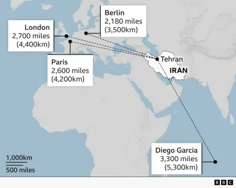Diego Garcia is nearly 4,000km (2,500 miles) from Iran and the Iranian attempt has raised alarms about the range of the country's missiles and fuelled fears that Iran could now also target much of Europe, even London.