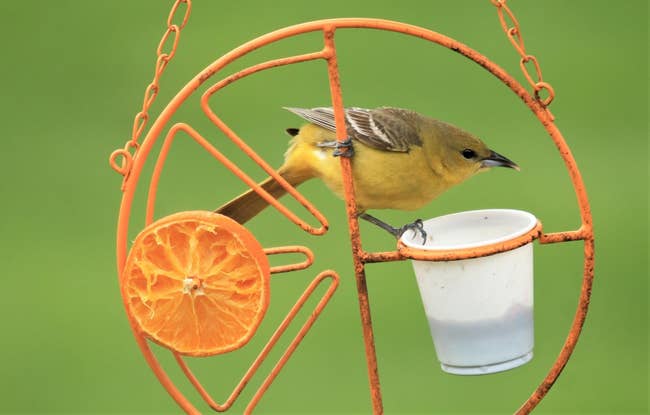Promising review: "I rarely write product reviews, but this has far exceeded my expectations. I saw my first-ever oriole a few weeks ago. He was here and then gone. Decided to get a feeder. I was unsure how this would work. I bought two. Put out the oranges and put grape jelly in the cups. Day one: Nothing. But on the second day, I had tons! Every day since, I have had at least 7–14 birds and am going through a ton of grape jelly." —Amazoncustomer