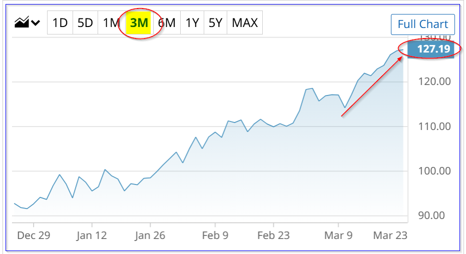 I suggested selling the $123.00 and $124.00 call options expiring April 2, when COP was at $117.00. So, at the time, this was an out-of-the-money (OTM) covered call play. Now those strike prices are in-the-money (ITM), but a covered call seller has made capital gains as well as the premium received (i.e., $3.64 and $3.25, respectively).
