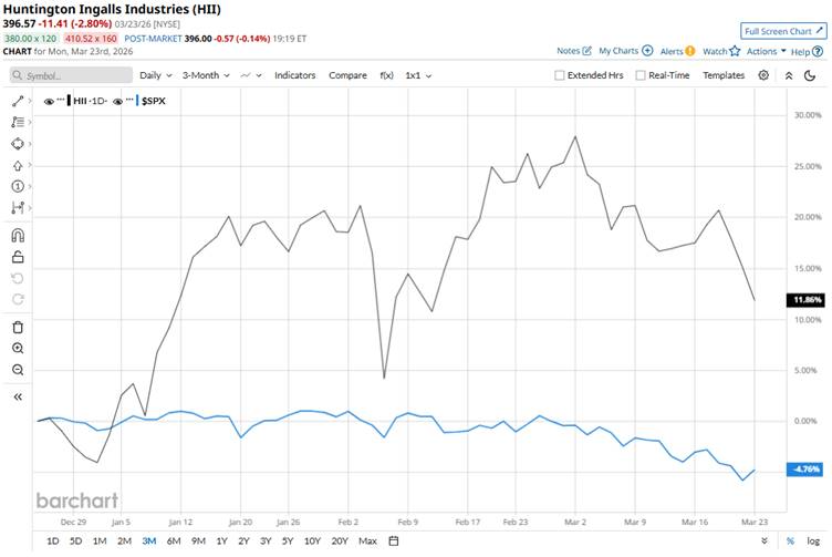 Huntington Ingalls Industries, Inc. (HII) is a leading defense contractor and the largest military shipbuilder in the United States, specializing in the design, construction, and maintenance of nuclear-powered aircraft carriers, submarines, and other naval vessels for the U.S. Navy. The company also provides a range of technical and mission-driven services through its Mission Technologies segment, supporting defense and government customers. Headquartered in Newport News, Virginia, Huntington Ingalls plays a critical role in U.S. national security. The company has a market cap of around $15.6 billion. Companies with a market cap of $10 billion or more are typically recognized as “large-cap stocks,” a designation that highlights their financial strength, resilience, and influence within their industries. Huntington Ingalls Industries comfortably falls into this category, underscoring its scale, stability, and competitive advantage. HII’s trusted expertise, long-standing defense contracts, and strategic role in national security reinforce its prominence and growth potential among peers in the defense sector. Stock Index Futures Rally as Oil Prices Tumble on U.S.-Iran Talks Unusual Options Activity Flares in META and SMCI Stock: What to Watch Next Amazon Is Planning a Smartphone Launch. Should You Buy AMZN Stock First? Markets move fast. Keep up by reading our FREE midday Barchart Brief newsletter for exclusive charts, analysis, and headlines. HII is 13.8% below its 52-week high of $460, reached on Mar. 2. The shipbuilding company stock has gained 11.9% over the past three months, outpacing the broader S&P 500 Index’s ($SPX) 4.8% slump over the same time frame. In the longer term, the stock has risen 43.7% over the past six months, outperforming SPX’s 1.1% decline. Moreover, shares have increased 96.8% over the past 52 weeks, beating SPX’s 16.1% returns over the same time frame. To confirm the bullish trend, HII has been trading mostly above the 50-day and 200-day moving averages over the past year. Shares of Huntington Ingalls Industries have risen over the past year and into 2026, driven by a combination of strong fundamentals and favorable industry tailwinds. The company delivered solid results, with consistent earnings beats over the trailing four quarters. Investors have also been encouraged by its large and growing backlog and expectations of significant future contract awards tied to rising U.S. naval spending, which provide long-term revenue visibility. Plus, HII’s push into higher-tech areas such as autonomous systems and AI-enabled shipbuilding has strengthened its growth narrative beyond traditional defense work. Combined with broader geopolitical tensions boosting defense budgets, these factors have fueled a strong rally in the stock over the past year and supported continued momentum in 2026. HII has also outpaced its rival, General Dynamics Corporation’s (GD) 7.5% gains over the past six months and 31.9% over the past year. The stock has a consensus “Moderate Buy” rating from the 12 analysts covering it, while the stock has already surged past its mean price target of $391.60. On the date of publication, Subhasree Kar did not have (either directly or indirectly) positions in any of the securities mentioned in this article. All information and data in this article is solely for informational purposes. This article was originally published on Barchart.com