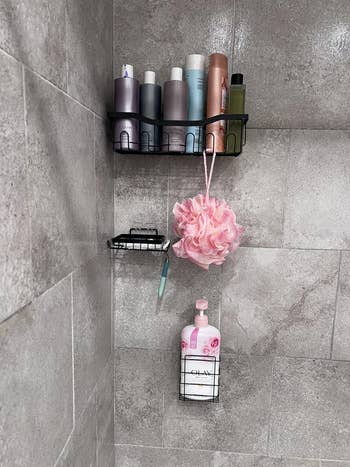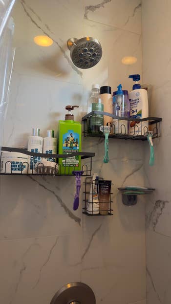 Promising review: "I’ve been on the search for something that creates extra space in our shower and have not found anything that worked until this. I’ve tried all the hanging ones, suction ones, but nothing has stayed or has been too bulky. We live in a tiny apartment, so a tiny shower. But these shower caddies are perfect. The adhesive is super strong and clear, so they go on great, and I haven’t had them get loose at all. There are different sizes, so I can arrange them the way I need. I’m very impressed so far and very pleased." —Breanna Hargis