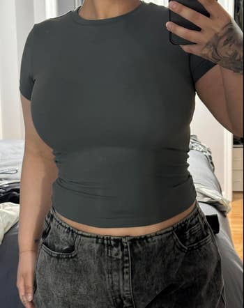 Promising review: "At first, I was a little skeptical — I have been wanting to find a Skims-like material shirt for a while but didn't want to pay the price of one, LOL, and this shirt feels amazing. I will be getting one in every color now." —Julianne