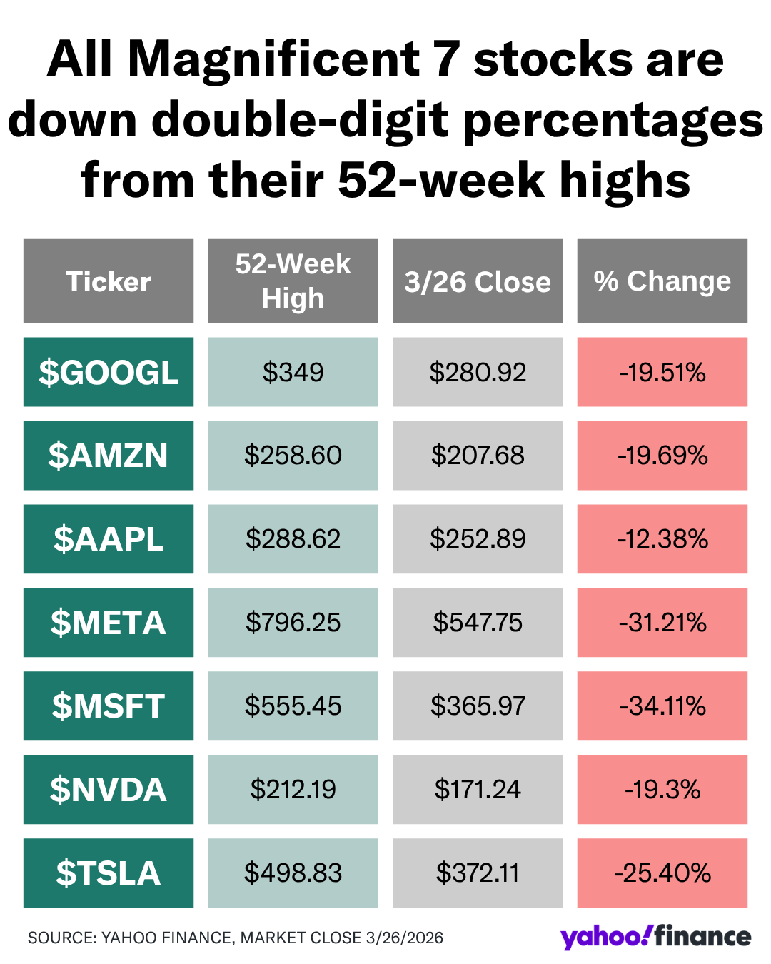 Even the specter of decades of AI dominance can't spark the "Magnificent Seven" right now. Every Magnificent Seven stock is down double-digit percentages from its 52-week high, according to data from Yahoo Scout (see chart below). Microsoft (MSFT) is down more than 30% from its highs after a quarter that showed slowing sales growth rates and big promises of aggressive capital expenditures. "I'm just not sure that right now is the time to jump in [on the Mag 7] โ I think there's a little bit more downside risk to them," Slatestone wealth chief market strategist Kenny Polcari said on Yahoo Finance's Opening Bid (video above). There are several explanations for the Mag 7 sell-off. Higher oil prices, driven by Operation Epic Fury, have reignited stubborn inflation, forcing the Federal Reserve to maintain a higher-for-longer interest rate stance. Rates at higher levels for a long period are a natural enemy of growth-oriented tech valuations, as they discount the value of future earnings. Meantime, capex commitments to build out AI infrastructure have spooked investors at the start of the year. Capital expenditures for the four major tech players โ Google (GOOGL, GOOG), Microsoft, Amazon (AMZN), and Meta (META) โ are expected to exceed $650 billion in 2026, a 60% surge from 2025. Spending at these levels could put downward pressure on profit margins. And lastly, institutional investors have rotated out of digital growth plays to perceived safe-haven war plays in energy, defense, and domestic manufacturing. "At some point, they're [Mag 7] going to become a value play," Polcari said. "And so certainly that will raise the interest. But I never owned them. I'm not going to jump in on them now. I just think there's other places for me to put my money." Brian Sozzi is Yahoo Finance's Executive Editor and a member of Yahoo Finance's editorial leadership team. Follow Sozzi on X @BrianSozzi, Instagram, and LinkedIn. Tips on stories? Email brian.sozzi@yahoofinance.com. Click here for in-depth analysis of the latest stock market news and events moving stock prices Read the latest financial and business news from Yahoo Finance