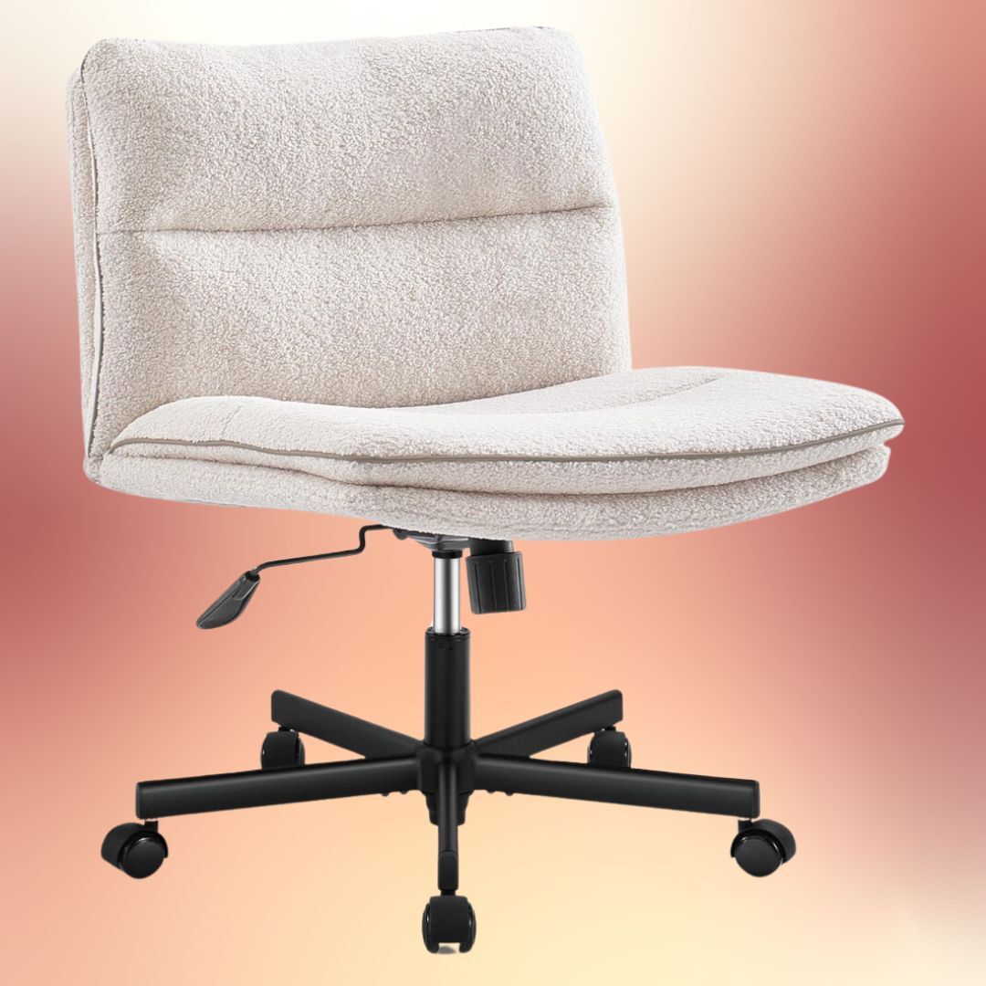 Built with a cushy and wide G-shaped seat made from a high-resilience foam, this armless swivel chair spins 360 degrees, tilts up to 130 degrees and is height-adjustable to accommodate your existing desk space. This non-wheel design can accommodate weights up to 350 pounds and it can be found in 11 colors, each one in a twill fabric upholstery.