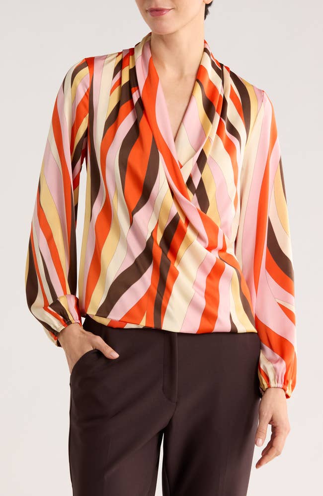 Promising review: "Elegant, beautiful blouse. I got this blouse in a floral print. It was more than what I expected on the hanger, and it does fit perfectly. I would say it is a dressy blouse that has a lining on the back part which helps to come down nicely and it can match so many pants or skirts colors. There was only one in the store when I found it, and it was my size!!!!  " —Chachyta