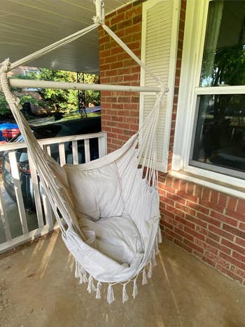 This swinging hammock chair comes with two cushions and installation hardware.