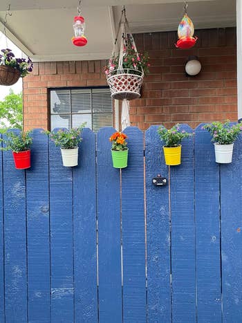 Promising review: "Lovely colorful flower pots. Perfect size to hold a single flower, and they add such a nice pop of color to my yard. Very easy to hang up, no hardware required! I’m getting a lot of compliments on them. I bought several sets and planted bright flowers in them. I have them lining the inside of my yard and on the front of the house. They add a lot of cheer and homeyness for a simple and cheap project." —Maegan