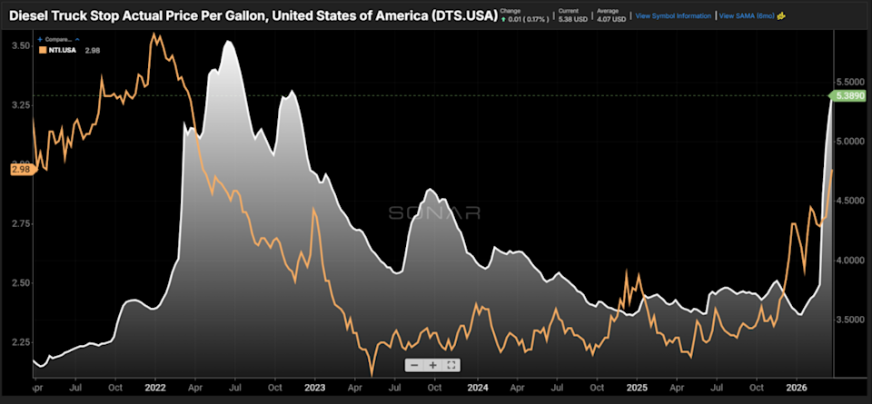 Chart of the Week: Diesel Truck Stop Actual Price Per Gallon, National Truckload Index – USA SONAR: DTS.USA, NTI.USA The average retail price of diesel (DTS) — the primary fuel source for Class 8 trucks — has risen over 41% since March 2. The average spot rate for dry van truckloads (NTI in orange) has increased 7.5% over the same stretch, forming a fairly strong positive correlation of 0.7, meaning they moved together fairly well. This is not always the case, however. In March 2022, the correlation was inverted at -0.8, meaning the two moved in opposite directions at nearly the same rate. This illustrates that fuel prices do not always drive truckload pricing movements. So what is the relationship between the two? Correlation is one of the most misused statistics. The famous adage is that correlation does not imply causation, and the world is full of spurious or coincidental correlations. This is not entirely true in the case of fuel and truckload rates, but like most things, it’s complicated. The underlying market value is what determines a carrier’s ability to pass along their costs. Fuel costs account for roughly 25% of the total operating cost of a truck, though this figure fluctuates as costs shift. According to the American Transportation Research Institute (ATRI), fuel costs fell from 28% to 21% of total operating costs between 2022 and 2024. The key takeaway is that fuel represents a significant portion of operating costs, even if its exact share varies. When fuel prices rise sharply, so does their influence on trucking costs. The majority of truckload moves operate under long-term pricing agreements between shippers and service providers. A portion of fuel costs is separated out as a variable surcharge tied to the average price of diesel — typically the weekly DOE figure — so short-term fuel price changes do not affect contract rates, as those costs are passed along separately. In the spot market, which the NTI measures, rates are typically quoted as all-inclusive totals with no component breakouts. Since all information about the load and its costs reflects current conditions, there is no need to separate costs into components. The price is simply what the market will bear at that point in time. In 2022, the truckload market was at the beginning of a collapse. The market value for trucking services was near all-time highs, driven by a severe imbalance between supply and demand — freight demand far exceeded available capacity. Demand (STVI in yellow) fell rapidly in March 2022 as many shippers realized that months of over-ordering had finally caught up with them. Pandemic-era quarantines were largely being lifted, and goods consumption declined. Meanwhile, truckload capacity had expanded dramatically over the prior two years. From June 2020 to October 2022, more than 131,000 new motor carrier operating authorities (CDTTA in white) were created — compared to roughly 104,000 created in the entire decade from January 2010 to June 2020. While these figures don’t represent individual drivers, they reflect a flood of new carriers competing for what had become far less freight, collapsing the market value of their services and leaving them unable to pass along additional costs. The pie chart above is based on ATRI’s 2024 report and excludes back-office and overhead functions at larger fleets. Fuel costs averaged $0.48 per mile (21%) that year — a figure that has since ballooned to over $0.77 per mile, assuming fuel efficiency of around 7 miles per gallon. Holding all other costs constant, fuel would account for roughly 30% of total operating costs today. Also missing from the chart is a measure of profit or loss. During a severe down cycle, carriers are often unable to generate enough revenue to cover their costs on many loads, pushing them to find efficiencies in their networks. A carrier whose costs totaled $2.26 per mile might have only been able to command $2.25. During the pandemic era, the opposite was true — operating costs were around $1.85 per mile in 2021, while spot market revenues averaged closer to $3.21 per mile. So when fuel prices rose during that period, market value was simultaneously deflating and profit margins were compressing rapidly. The current market is different. Truckload service values are rising — before the recent jump in oil prices, spot rates were already averaging 13% higher year-over-year compared to January and February 2025, reflecting shippers’ need to offer higher prices to secure capacity. Carriers are now better positioned to pass along higher costs in the spot market. But this is not always the case. The cost of operating a truck has increased more than 30% since 2019, yet spot rates over the same period were up only about 10% leading into the holidays last year. A cost increase does not automatically translate into a price increase — a reality that holds true across many industries, not just trucking. The FreightWaves Chart of the Week is a chart selection from SONAR that provides an interesting data point to describe the state of the freight markets. A chart is chosen from thousands of potential charts on SONAR to help participants visualize the freight market in real time. Each week a Market Expert will post a chart, along with commentary, live on the front page. After that, the Chart of the Week will be archived on FreightWaves.com for future reference. SONAR aggregates data from hundreds of sources, presenting the data in charts and maps and providing commentary on what freight market experts want to know about the industry in real time. The post Does the price of diesel drive truckload rates? appeared first on FreightWaves.