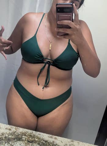 Promising review: "I absolutely love it! This swimsuit is everything I’ve been looking for — comfortable and stylish. The ruched detailing on the sides helps create a smooth, sculpted look while still being incredibly stylish for my body type. The high-cut sides really elongate my legs. As someone who’s on the shorter side, I really appreciate how this design makes me look taller and gives my legs that extra boost. I bought a large, and I am 5 feet tall and about 150 pounds. The fabric is high-quality and feels soft against the skin, yet it’s durable enough to hold up well in the water. It also has just the right amount of stretch, providing a snug but comfortable fit without feeling restrictive. The coverage is perfect — not too much, but just enough to make you feel confident while still looking sexy and remaining family-friendly. I also really like the olive color that I got. It complements my skin tone (light-medium beige). I’ve received so many compliments every time I wear it, and I would highly recommend it to anyone looking for a stunning swimsuit that is versatile!" —Henn.C