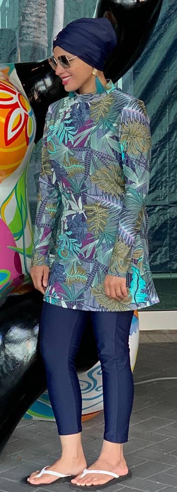 Promising review: "I recently purchased this swimsuit, and I couldn’t be happier with the quality and design. The material is lightweight, breathable, and dries quickly, making it perfect for both swimming and lounging by the water. The modest coverage gives me comfort and confidence without compromising style. The fit is excellent. I usually wear a large size, but I bought one size bigger. For reference, I’m 5’3” and 160 pounds. It’s a must-have for anyone looking for a modest yet practical swimsuit. Highly recommend!" —Fraz Khalil