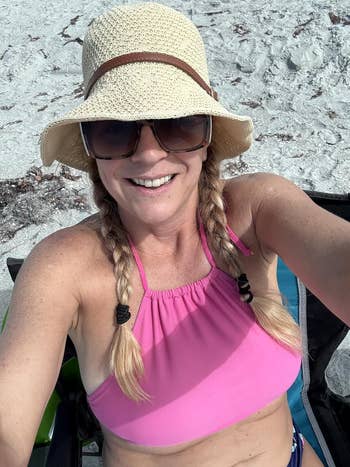 Promising review: "Love love love! I’m getting more colors. By far, the best bathing suit top I’ve ever found. The straps are thick and supportive, the back is wide and doesn’t give me any bulging or armpit rolls, and the front fits great on the girls! I’m 5’0” and about 165 pounds. I have a really wide ribcage (40B bra size), and I got a large, which fits perfectly. My only gripe is that the edge rolls a little from the inside, exposing the liner, which is white, so it’s a stark contrast and really obvious, but it’s not bad enough to dissuade me from getting another one." —Courtney
