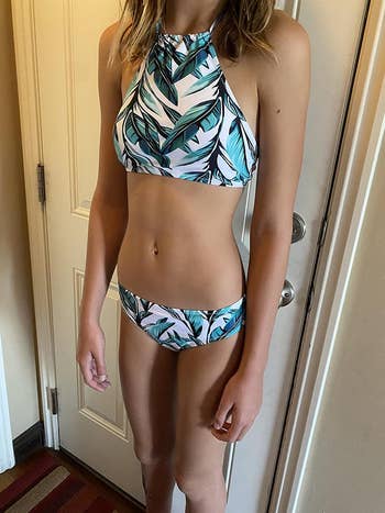 Promising review: "Love this high-neck style as it provides nice coverage on top. The top and bottom can be mixed and matched, too, which I love having as an option. Bought this style in several different patterns and designs over and over again. Holds up well in the wash and does not fade." —Karen Gouge
