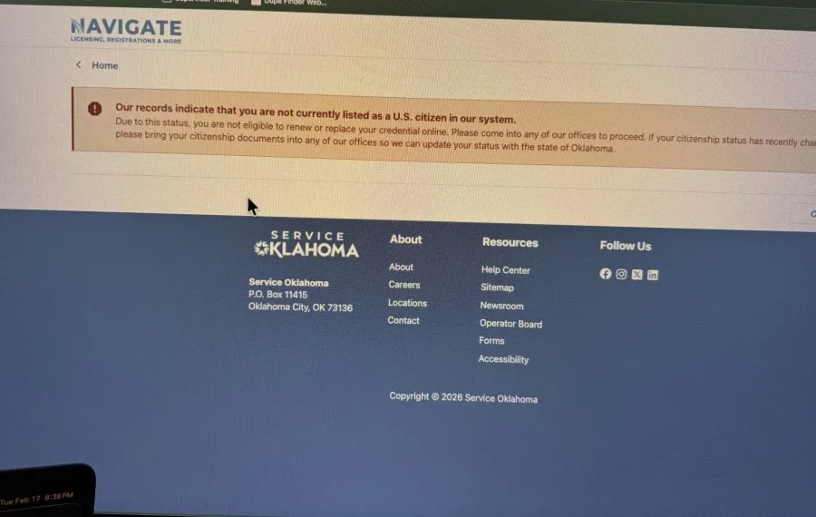 OKLAHOMA CITY (KFOR) — Some Oklahomans are having trouble renewing their driver’s license online. Last month, Service Oklahoma updated its system to make driver’s licenses and vehicle services fast. Service Oklahoma to launch faster, unified system for driver license and vehicle services However, some say they’re receiving a message that says they are not U.S. citizens. “Our records indicate that you are not currently listed as a U.S. citizen in our system,” said Ceciley Thomason, a woman trying to obtain a state driver’s license. This is the message some Oklahomans are getting while trying to obtain a license online. I’m going to be honest, it was alarming because around that time there were some very scary things going on with immigration,” said Thomason. Ceciley Thomason was trying to get a state driver’s license online after she moved. “My husband, he does have a real ID already, and he was able to go in through, no problem,” said Thomason. “Then, when I went to go change or update my ID, I got the screenshot that you saw on Facebook, where it says, we don’t have you as a citizen. I was like, that’s strange.” Thomason is a citizen of the Cherokee Nation. She says she already has a tribal driver’s license and passport card. Thomason says while filling out the information online, she input her driver’s license number and social security number, but still received the message. She tried multiple browsers but was still told she is ‘not listed as a U.S. citizen.’ “I cannot imagine being someone who is going through this and also actively worried about an immigration issue,” said Thomason. News 4 reached out to Service Oklahoma about this issue. We’re aware that some customers may see this message when attempting to complete a renewal online. While the wording is not as clear as it should be, it is simply indicating that additional information is needed before the transaction can be completed. Not all customers are eligible to renew online for a variety of reasons, including when certain documentation needs to be verified. In these cases, customers can quickly complete their renewal in person at a Service. Oklahoma location or with a licensed operator. We are updating our messaging to ensure it is more clear and helpful for customers moving forward. Service Oklahoma Thomason recently went to the tag agency to handle the issue in person, but at last check, the status of her license is not pending, and she still receives the same message. Copyright 2026 Nexstar Media, Inc. All rights reserved. This material may not be published, broadcast, rewritten, or redistributed. For the latest news, weather, sports, and streaming video, head to KFOR.com Oklahoma City.