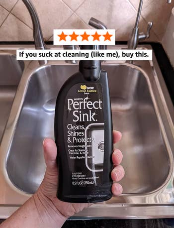 BuzzFeed deputy editorial director Maitland Quitmeyer loves it! She said, "I bought this for my white porcelain kitchen sink and I've since texted five people about it, which is really a lot for such a boring grown-up product. It cleans beautifully, but the *best* thing about it is its ability to repel stains after cleaning. You know that thing when you rinse out your coffee cup and the coffee water just lingers in your sink, and you have to purposefully rinse it out for two minutes? You don't have to do that — the coffee can't stick to the sink and just goes RIGHT down the drain. Time saved, sink clean — this is really a Virgo dream product right here."