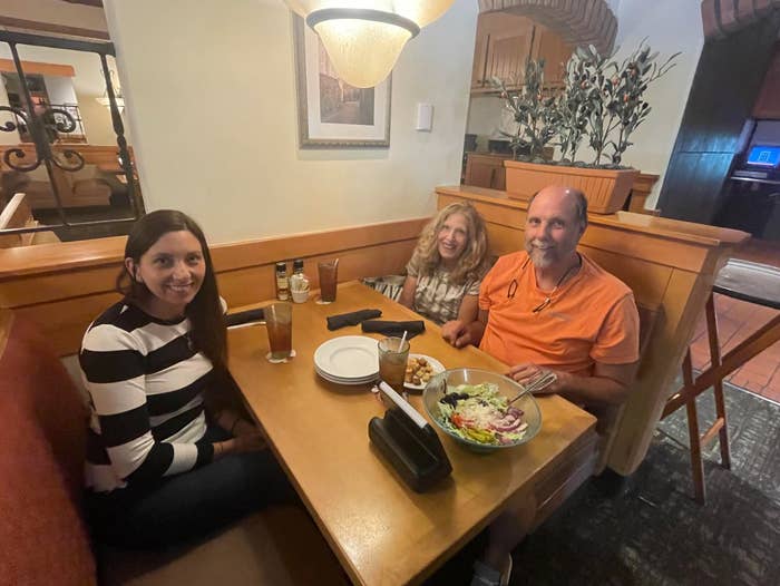 The author and her parents celebrating a recent writing success at the Olive Garden where she used to work.