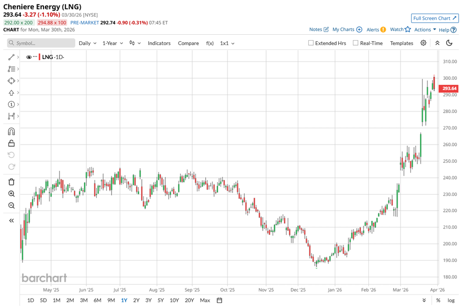 Energy prices could be on the verge of a sharp move higher, and the market may not be fully prepared for what comes next. Richard Haass, president emeritus of the Council on Foreign Relations, has warned that prices could “skyrocket” if the Iran war drags on without a diplomatic breakthrough. In his view, the market has underreacted, largely because the full supply disruption has yet to show up in real time. Tankers that passed through the Strait of Hormuz before tensions escalated are only now reaching destinations such as Europe. Meanwhile, the pipeline behind them has thinned. As incoming supply slows, the market could quickly feel the strain, allowing prices to move higher with little resistance. This Dividend King Is Down 26%. When Will It Bounce Back? Ignore the TurboQuant Panic and Keep Buying Seagate Technology Stock, Says JPMorgan While the S&P 500 Struggles, These 3 Energy Dividend Stocks Are Soaring Tired of missing midday reversals? The FREE Barchart Brief newsletter keeps you in the know. Sign up now! In that environment, Cheniere Energy (LNG) emerges as one of the most compelling ways to play the trend. The stock has already pushed toward $300, reflecting growing investor conviction. With more than 95% of its capacity tied to long-term contracts, the company would secure stable cash flows while preserving upside through uncontracted volumes that can benefit from tighter pricing. At the same time, Cheniere Energy continues to secure long-term deals, including expanded Thailand orders and a 25-year agreement with Taiwan’s CPC, sharpening earnings visibility. Steady expansions at Sabine Pass and Corpus Christi, paired with a $10 billion buyback and strong cash flow, are strengthening the company’s case as one of the top oil stocks to grab. Headquartered in Houston, Texas, Cheniere Energy sits at the heart of the global LNG trade, building and running export terminals at Sabine Pass and Corpus Christi while connecting them to key pipeline networks. The company also markets and trades LNG across major international markets, giving it both scale and reach. With a market cap of about $61.7 billion, the stock has stayed firmly in rally mode. It has gained 24.35% over the past 52 weeks and surged 44.7% in 2026 alone. In just one month, the stock has jumped 19.34%, reflecting strong momentum as global energy tensions intensify. From a valuation standpoint, the stock is currently trading at 21.09 times forward adjusted earnings and 2.76 times sales. The figures sit at a premium when compared to the industry averages and their own five-year average multiples. On the income side, Cheniere has raised dividends for four consecutive years. The company pays an annual dividend of $2.22 per share, offering a yield of 0.76%. Its latest payout of $0.56 per share went out on Feb. 27 to shareholders on record as of Feb. 6. On Feb. 26, Cheniere Energy delivered a strong set of Q4 fiscal 2025 results, wherein revenue climbed 22.9% year-over-year (YOY) to $5.5 billion, coming in comfortably ahead of Street expectations of $5.2 billion. The top line beat reflects robust LNG demand and efficient execution at its core facilities. Net income surged 135.6% to $2.3 billion, while consolidated adjusted EBITDA rose 29.8% to $2 billion, driven primarily by higher LNG volumes delivered during the quarter. The company generated distributable cash flow of $1.5 billion in Q4 and $5.3 billion for the full year, exceeding the high end of its guidance range by roughly $100 million. Balance sheet strength remains firmly in place for Cheniere Energy. The company closed the year with $1.1 billion in cash and cash equivalents and total available liquidity of $8.8 billion, giving it ample flexibility to fund growth and navigate volatility. Operationally, it exported 185 LNG cargoes during the quarter, underscoring both scale and consistency. Looking ahead, the company expects momentum to carry through 2026. Management remains on track to deliver another annual production record, supported by the anticipated completion of the remaining three trains under Stage 3. The expansion should steadily lift output and strengthen its position in a tightening global LNG market. Guidance reflects confidence. For full-year 2026, management projects consolidated adjusted EBITDA in the range of $6.75 billion to $7.25 billion and distributable cash flow between $4.35 billion and $4.85 billion. It also expects per-unit distributions at CQP to fall between $3.10 and $3.40, reinforcing a strong cash return profile. Analysts see earnings accelerating sharply. Q1 fiscal 2026 EPS is expected to surge 128% YOY to $3.58. For the full fiscal year 2026, the bottom line is projected to rise 26.1% to $14.08, followed by a further 1.9% increase to $14.35 in fiscal year 2027. Wall Street has grown increasingly confident in Cheniere Energy. At Goldman Sachs, analyst John Mackay raised his price target from $276 to $312 while maintaining a “Buy” rating on LNG stock. Meanwhile, at Morgan Stanley, Devin McDermott upgraded the stock from “Equal-Weight” to “Overweight” and lifted his target from $236 to $313. At BofA Securities, Jean Ann Salisbury reaffirmed her “Buy” rating and raised her price target to $322 from $296, keeping pace with improving earnings visibility. At the same time, J.P. Morgan analyst Jeremy Tonet maintained an “Overweight” rating and increased his target to $338 from $279, adding further weight to the bullish narrative. The broader analyst community echoes the optimism. Among 22 analysts covering LNG stock, the overall rating sits at “Strong Buy,” with 18 calling it a “Strong Buy,” two assigning a “Moderate Buy,” and two opting to “Hold.” To that end, the mean price target of $294.95 signals marginal 4% potential upside. Meanwhile, the Street-high target of $340 suggests a gain of 20% from current levels. On the date of publication, Aanchal Sugandh did not have (either directly or indirectly