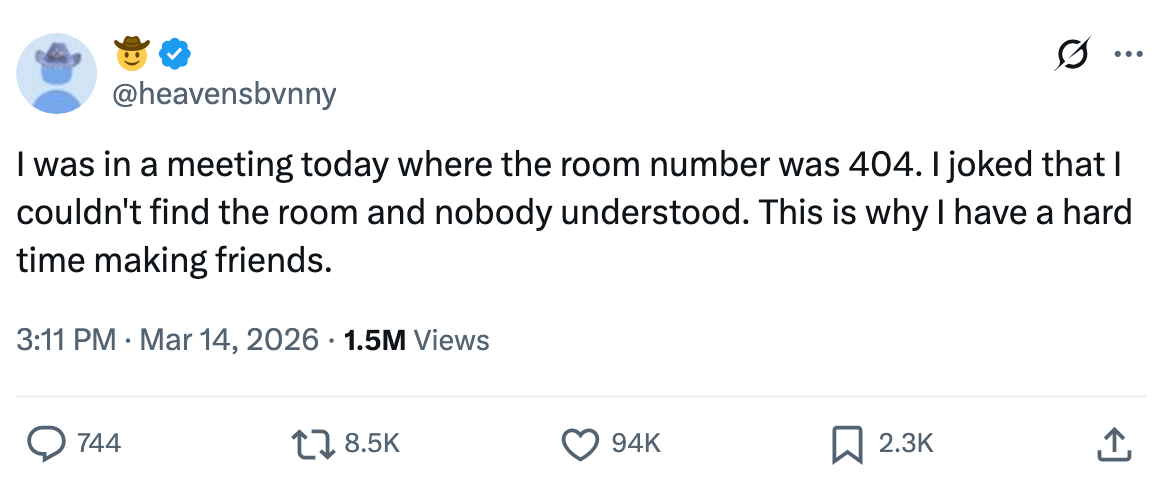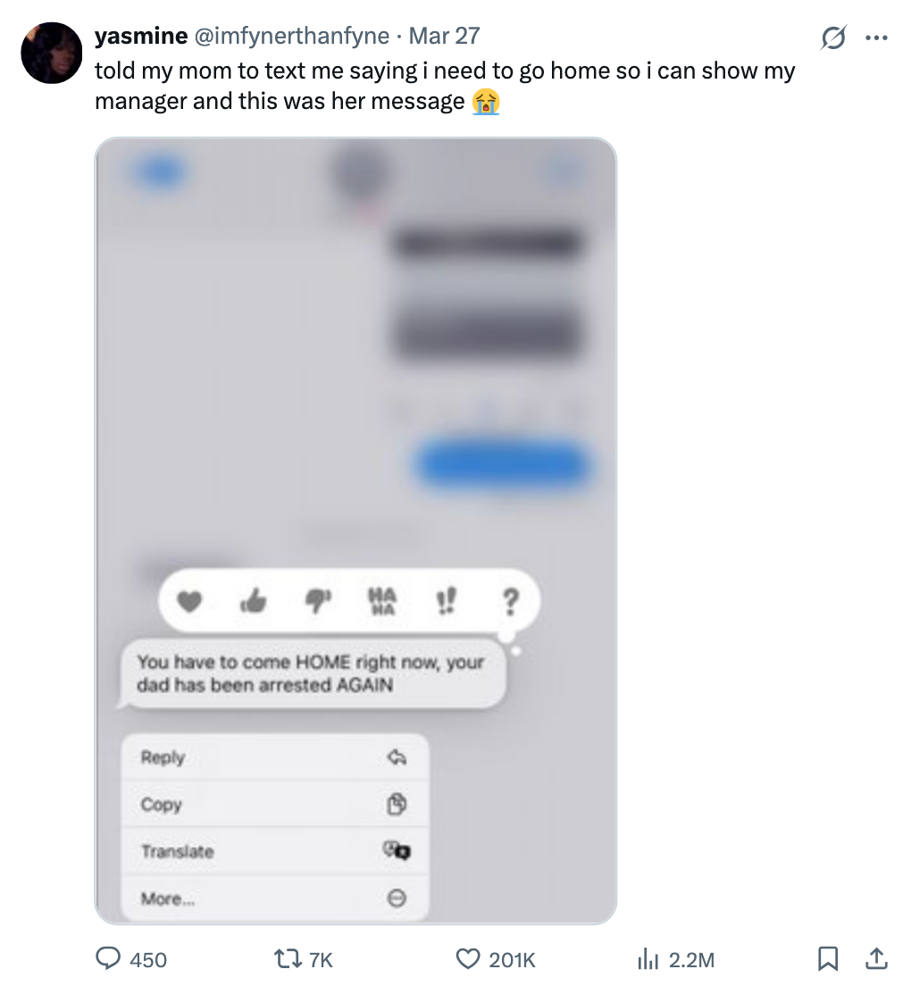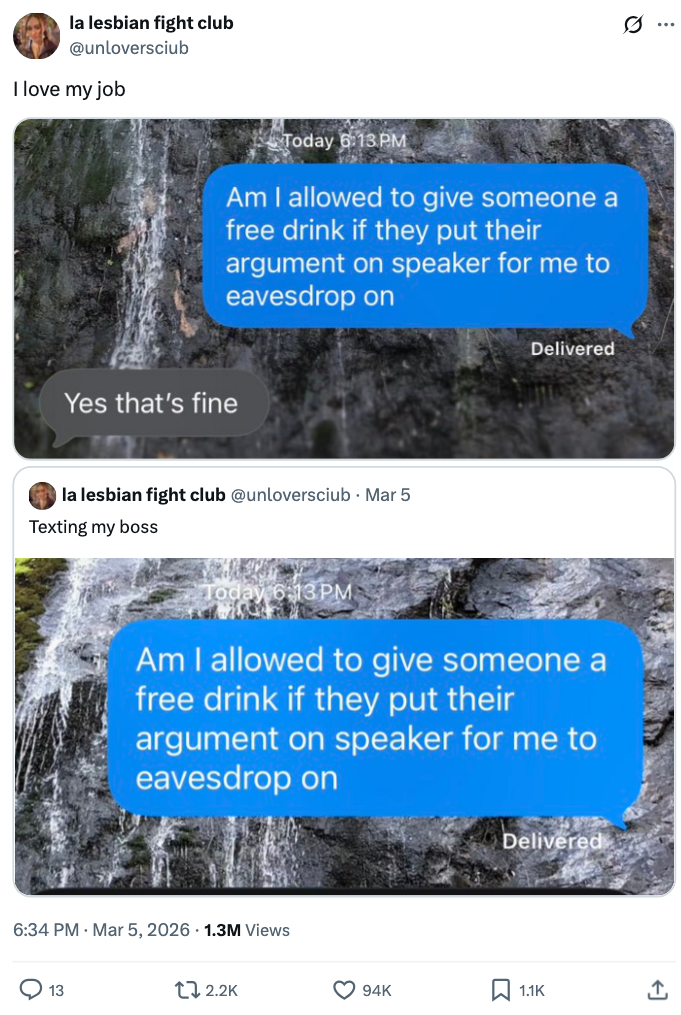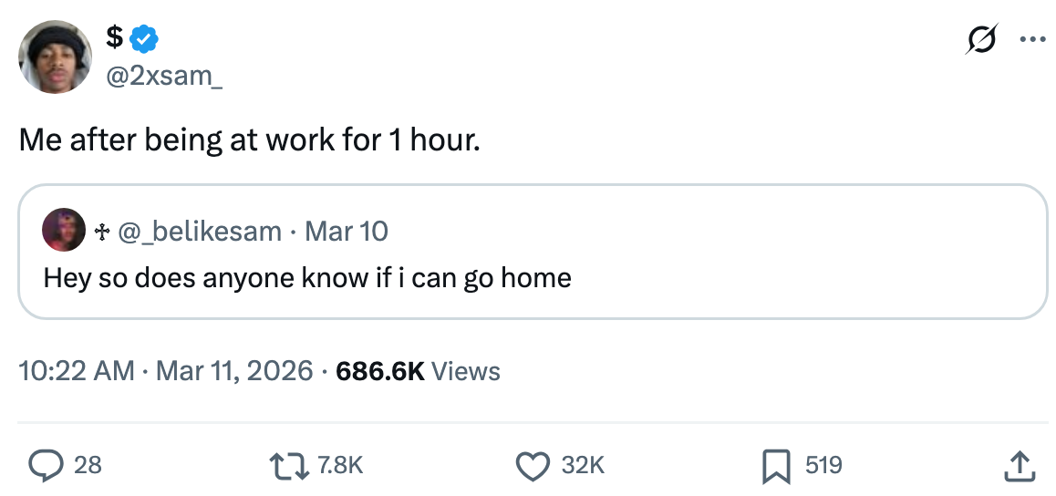 "at work today i served a little girl some ice cream, and her mom says 'honey, what do u say?' And she looks me dead in the eyes and says 'I love u'" I'm Chelsea, the Weekend Editor at BuzzFeed, where I cover everything from pop culture and politics to TV and celebrity news. on my 7th bathroom break at work pic.twitter.com/3lIlix7jLx Ayer fingí estar enfermo para salir temprano del trabajo; hoy, dos compañeros avisaron que no se presentarían porque los contagié. Malditos mentirosos. 😂 pic.twitter.com/ulthBYKKHQ walked out of the staff bathroom at work and my coworker walked in after me and said “whew!” pic.twitter.com/XUbDxINq58 How it feels when you just see a problem at work and then remembering how much you are actually paid pic.twitter.com/JDvtkaw4qv i’m about to tip ANDREW $10… cause THAT’S HOW TF YOU DOOR DASH! 😂 pic.twitter.com/5cwO0a8Nqx Me calling my boss on his day off just like he did on mine pic.twitter.com/NKJS6Y9YBW sent a third follow up email for work and got a reply saying “please stop emailing as this person has died.” pic.twitter.com/heoGLmSDJL Tweeting on the clock while my coworkers give it their all pic.twitter.com/fFBwDBGIXG how HR sleeps after posting a job they already planned to fill internally anyway pic.twitter.com/m81ts7r23O my boss walked into my office wanting to have a one on one. he told me i was getting a 15% raise and im excited! however i was trying so hard to close out all my tabs from looking at other jobs 😭 pic.twitter.com/lzoLIlgcXk Colleagues: it’s Friday let’s get drinks when we knock off. Me: pic.twitter.com/uN3D6pwnns My coworkers asked for a birthday party, so I told everyone not to bring lunch tomorrow...then I took the day off. pic.twitter.com/93QNpsygdU