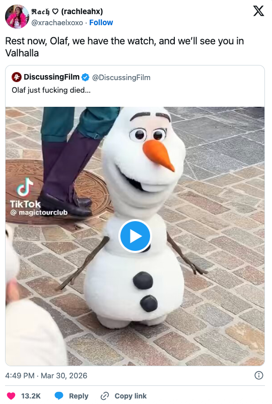 Looks like Olaf went "into the unknown." Angelica Martinez is the Latine Editorial Lead at BuzzFeed and covers a little bit of everything, from quizzes and true crime to celebrities and pop culture. *Kidding, kidding! Per park goer @coasterclairee, Olaf is back up and running today.