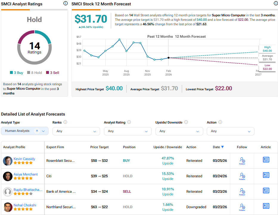 Investors are starting to lose confidence in computer hardware firm Super Micro Computer (SMCI) despite its strong sales growth, close ties to chipmaker Nvidia (NVDA), and a key role in building AI data centers. This comes after co-founder Wally Liaw was indicted for allegedly bypassing U.S. export restrictions to China, which triggered another wave of selling. While Liaw has stepped down and the company says it is cooperating, the damage to sentiment has already been done, especially since this isn’t an isolated problem. Unlock hedge fund-level data and powerful investing tools for smarter, sharper decisions Discover top-performing stock ideas and upgrade to a portfolio of market leaders with Smart Investor Picks Indeed, Super Micro has faced multiple issues over the years, including delays in filing financial reports that nearly led to a delisting. Because of its history, some investors are now stepping away completely. According to Bloomberg, Tortoise Capital recently exited its position following the indictment, while Zacks Investment Management described the stock as “uninvestable” for now due to uncertainty around management and potential legal exposure. Still, not everyone is bearish. Some investors continue to hold the stock because of its strong position in the AI infrastructure market and expected revenue growth that could exceed $40 billion in Fiscal 2026, an 87% year-over-year increase. In addition, the stock now trades at just over 7 times forward earnings, which is well below both its historical average and the broader market. However, the key issue is trust. Investors want reassurance that these problems are isolated and that stronger controls are in place. Turning to Wall Street, analysts have a Hold consensus rating on SMCI stock based on three Buys, eight Holds, and three Sells assigned in the past three months, as indicated by the graphic below. Furthermore, the average SMCI price target of $31.70 per share implies 46.6% upside potential. Disclaimer & DisclosureReport an Issue