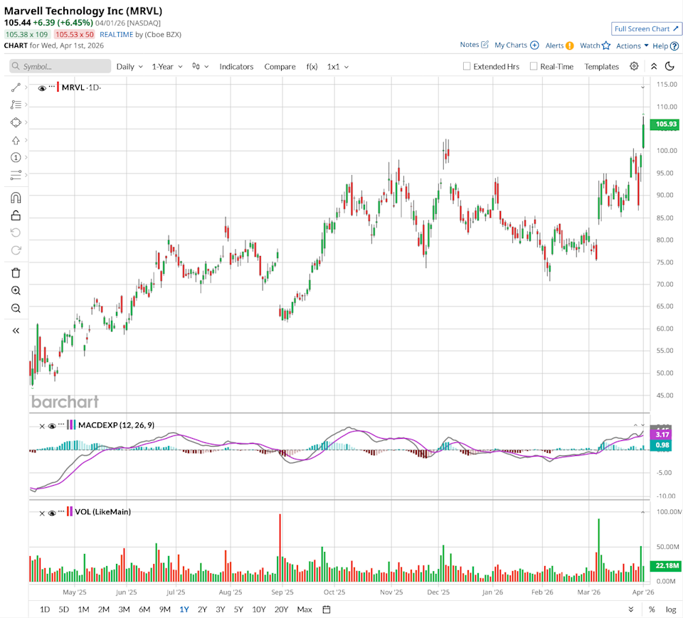 The race to build AI infrastructure just got a lot more interesting. Marvell Technology (MRVL) and Nvidia (NVDA) have announced a strategic partnership that puts Marvell directly inside Nvidia's AI factory ecosystem. Nvidia is also backing the deal with a $2 billion investment in Marvell. MRVL stock surged almost 13% yesterday, valuing the chipmaker at a market cap of $86.6 billion. For investors watching MRVL stock, the deal raises an obvious question: Is this the catalyst that takes shares to the next level? Stock Index Futures Rally on Prospect of End to Middle East Conflict, U.S. Economic Data and Fed Speak in Focus Bye Bye, AMD! Cathie Wood Ditches 57K Advanced Micro Shares Cathie Wood Adds 48K Shares to This Under-the-Radar Growth Play Our exclusive Barchart Brief newsletter is your FREE midday guide to what's moving stocks, sectors, and investor sentiment - delivered right when you need the info most. Subscribe today! The partnership is built around Nvidia's NVLink Fusion platform: a rack-scale system that lets companies build custom artificial intelligence infrastructure using Nvidia's ecosystem. Under the agreement, Marvell will supply custom XPUs (accelerator chips) and scale-up networking that plug into the NVLink Fusion architecture. Nvidia brings its Vera CPU, ConnectX network cards, BlueField data processing units, NVLink interconnect, and Spectrum-X switches. Put simply, Marvell makes the specialized silicon and connectivity, and Nvidia ties it all together into a full AI compute stack. The two companies will also collaborate on silicon photonics technology and work together to turn global telecom networks into AI infrastructure via Nvidia's Aerial AI-RAN for fifth- and sixth-generation networks. "The inference inflection has arrived," Nvidia CEO Jensen Huang said in a statement. "Together with Marvell, we are enabling customers to leverage NVIDIA's AI infrastructure ecosystem and scale to build specialized AI compute." Marvell Chairman and CEO Matt Murphy added that the deal connects Marvell's strengths in optical DSP, silicon photonics, and custom silicon directly to Nvidia's growing AI ecosystem. Marvell has been quietly building one of the most compelling AI infrastructure businesses in the semiconductor sector. In its fiscal fourth quarter of 2026, the company posted record revenue of $2.22 billion, up 22% year-over-year (YoY). Its data center segment grew 21% to $1.65 billion, driven by surging demand for optical interconnects, custom chips, and switching products. For the full fiscal year, Marvell's data center revenue surpassed $6 billion, growing 46% YoY. Its custom chip business doubled in that same period. Looking ahead: Marvell is projecting fiscal 2027 revenue of nearly $11 billion, up from the $10 billion it had guided to just three months earlier. It expects data center revenue to grow roughly 40% in fiscal 2027. For fiscal 2028, the company is targeting close to $15 billion in total revenue, with data center growth accelerating closer to 50% YoY. Non-GAAP earnings per share could exceed $5 in fiscal 2028 based on those projections, according to the company's earnings call. "We're very much on track to those targets that we had set," Murphy said during the call. The Nvidia investment and partnership add a new layer to an already-strong growth story. Marvell had already secured design wins with three Tier 1 U.S. hyperscalers for its active electrical cable products and expects combined AEC and retimer revenue to more than double YoY in fiscal 2027. Its optical interconnect business is growing at roughly 50% annually. Now, with Nvidia's $2 billion backing and a formal role in NVLink Fusion, Marvell gains access to Nvidia's vast customer base: hyperscalers and model builders building the AI factories Huang described. The risks are real. Marvell's custom chip business is concentrated among a small group of large customers. And as margins on full rack-scale system sales tend to run lower, investors should watch gross margin trends closely. Still, the combination of record bookings, rising revenue guidance, and now a formal Nvidia partnership gives Marvell a clear runway heading into the next phase of the AI buildout. For investors comfortable with semiconductor-sector volatility, the case for MRVL stock looks increasingly hard to dismiss. Analysts tracking MRVL stock forecast revenue to increase from $8.2 billion in fiscal 2026 (ended in March) to $25 billion in fiscal 2031. In this period, adjusted earnings per share are projected to expand from $2.84 to $10.27. If the tech stock is priced at 25x forward earnings, it could more than double over the next four years. Out of the 35 analysts covering MRVL stock, 25 recommend “Strong Buy,” three recommend “Moderate Buy,” six recommend “Hold,” and one recommends “Strong Sell.” The average Marvell stock price target is $119.53, above the current price of $105. On the date of publication, Aditya Raghunath did not have (either directly or indirectly) positions in any of the securities mentioned in this article. All information and data in this article is solely for informational purposes. This article was originally published on Barchart.com