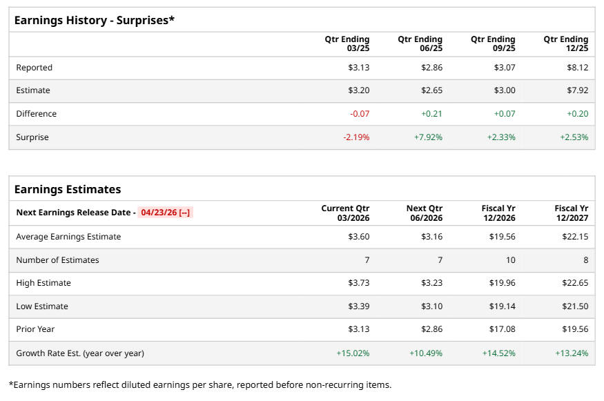London, the United Kingdom-based Willis Towers Watson Public Limited Company (WTW) operates as an advisory, broking, and solutions company worldwide. Valued at $27.4 billion by market cap, the company provides a range of insurance brokerage, reinsurance, and risk management consulting services. The leading global advisory, broking, and solutions company is expected to announce its fiscal first-quarter earnings for 2026 in the near future.
