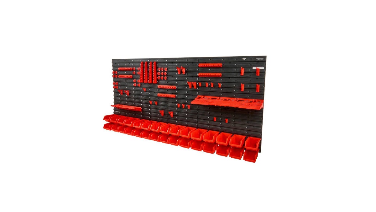 This wall-mounted bin system keeps tools and small parts off the floor and within reach. Stackable compartments save space, while tools snap into place along the panel.