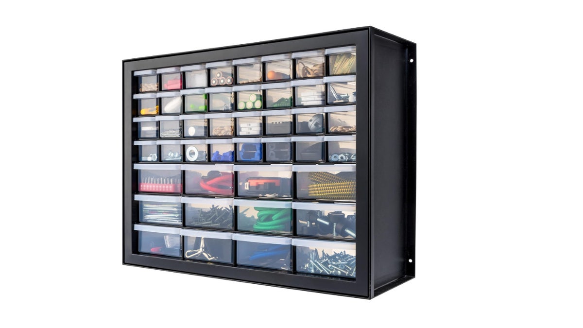This organizer keeps screws, drill bits and other small parts off the floor. The 44 drawers vary in size to store tools and hardware neatly, with extra space on top for larger items.