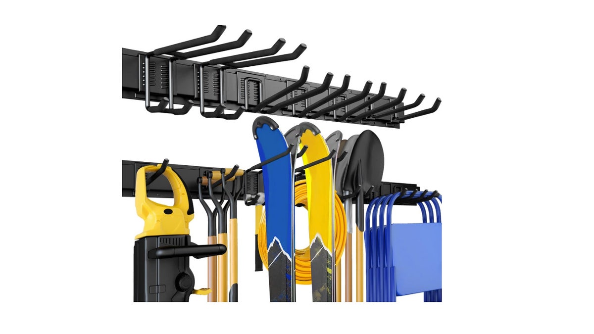Keep your garage clutter in check with this wall rack that stores everything from extra chairs to gardening gear. The adjustable hooks help you customize the layout, while the heavy-duty design anchors items in place.