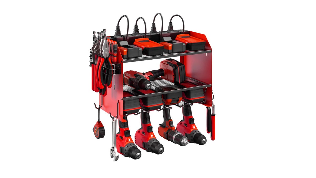 Power tools don’t always fit in standard toolboxes, but this rack keeps them organized and within reach. It holds four drills and includes side hooks for extra storage, plus a built-in power strip for charging batteries.