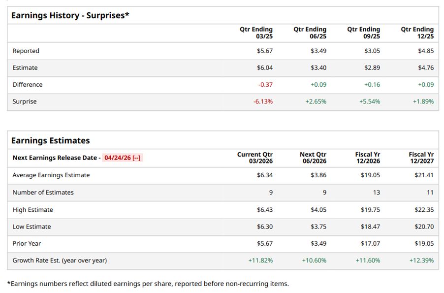 Aon plc (AON), headquartered in Dublin, Ireland, is a professional services firm that provides a range of risk and human capital solutions. With a market cap of $69.2 billion, the company's services include helping manage risk for clients, negotiating and placing insurance risk with other carriers, and advising clients related to health and benefits, retirement, compensation, strategic human capital, and human resource outsourcing. The leading professional services firm is expected to announce its fiscal first-quarter earnings for 2026 in the near term.
