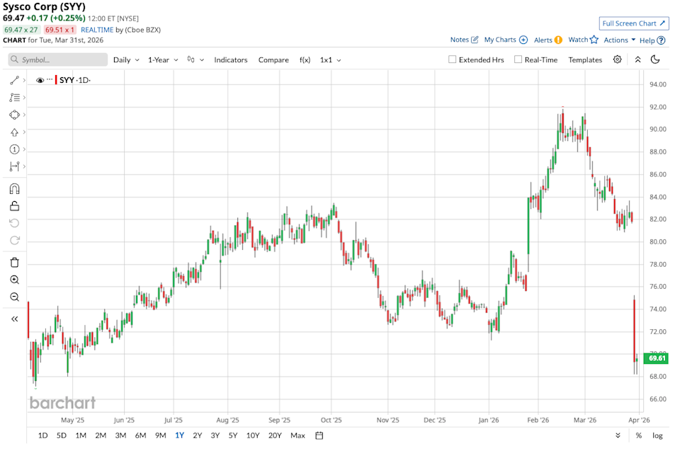 Sysco (SYY) just made its biggest bet in years. On March 30, the largest U.S. foodservice distributor announced a $29.1 billion acquisition of Jetro Restaurant Depot, propelling it into the high-margin cash-and-carry channel serving smaller independent operators. The deal instantly boosts Sysco’s scale but has triggered a sharp selloff. SYY stock plunged 15% intraday on March 30, marking the largest single-day percentage decline since the March 2020 Covid-19 crash. Apple Just Turned 50 Years Old. Is the AAPL Stock Cake Stale or Sweet? AMAT, LRCX: Bank of America Is Still Pounding the Table on These 2 Chip Stocks The Iran War Thrust Aluminum Prices Into the Spotlight, but Is There a Long-Term Bull Case for Rio Tinto Stock? Stop Missing Market Moves: Get the FREE Barchart Brief – your midday dose of stock movers, trending sectors, and actionable trade ideas, delivered right to your inbox. Sign Up Now! Investors are focused on the downsides — $21 billion in new debt that will push leverage up from 2.9 times to roughly 4.5 times, 91.5 million new shares diluting owners by 19.1%, the sudden end to Sysco's big buyback program, and S&P Global cutting the credit outlook to Negative. At the same time, Sysco still offers a solid annualized dividend of $2.16 per share, yielding around 3% at current prices, backed by 55-straight years of increases as a Dividend King. Wall Street is nervous about all the debt and the risks of making this deal work. But with that steady payout, the big question is whether Sysco's reliable dividend can sweeten what looks like a high-stakes gamble. Let’s take a closer look. Headquartered in Houston, Texas, Sysco is the world’s largest food‑away‑from‑home distributor, selling and delivering food and related products to about 730,000 customer locations across restaurants, healthcare, education, lodging, and other institutional channels. SYY stock trades near $72, down sharply from the 52-week high of $91.85. Shares are down about 2% year-to-date (YTD) and down 4% for the past 12 months. The stock has experienced significant volatility recently, with a 13% five-day decline largely attributable to the acquisition announcement, which sent shares reeling from a pre-deal close of $81.80. SYY stock carries a forward price-to-earnings (P/E) ratio of 15 times, with a market capitalization of roughly $34.1 billion. Sysco's second-quarter fiscal 2026 results showed sales of $20.8 billion, reflecting 3% year-over-year (YOY) growth. U.S. Foodservice volume grew 0.8% overall and 1.2% locally, marking the third consecutive quarter of positive local case growth. Gross profit rose 3.9% to $3.8 billion, with margins expanding 15 basis points to 18.3%. Adjusted operating income increased 3.1% to $807 million, while adjusted net earnings grew 3.9% to $476 million. Adjusted EPS came in at $0.99, climbing 6.5% YOY, while adjusted EBITDA rose 3.3% to $1 billion. Sysco ended the quarter with $1.2 billion of cash and total liquidity of about $2.9 billion. Net debt to adjusted EBITDA stood at around 2.9 times, consistent with an investment‑grade balance sheet before the Jetro deal. CEO Kevin Hourican highlighted “strong results […] driven by increased local case growth” and momentum from key initiatives while CFO Kenny Cheung emphasized “high-quality performance across the income statement and cash flow.” The company's figures underscore operational discipline even as the market digests Sysco's transformative acquisition. Sysco's move to acquire Jetro Restaurant Depot for $29.1 billion marks a major expansion into the high-margin, resilient cash-and-carry segment. The deal includes $21.6 billion in cash and 91.5 million shares of SYY stock issued to Jetro shareholders. Based on the stock’s $81.80 closing price on March 27, that values Jetro at about 14.6 times its operating income, or 13 times once counting the expected savings. To pay for it, Sysco is borrowing roughly $21 billion in new debt and using about $1 billion from cash or other sources. That will push its leverage higher for a bit, so mangement is pausing share buybacks while they focus on paying down the debt. Jetro, which serves a $60 billion to $70 billion market, will run as its own segment within Sysco. Management expects about $250 million in yearly cost savings within three years, mostly from better purchasing and supply‑chain efficiencies. Mangement also believes the deal should add mid‑ to high‑single‑digit percentage growth to EPS in the first year and ramp to low‑ to mid‑teens in the second year. As for the dividend, Sysco isn’t touching it. The company just declared the next quarterly payment, keeping the annual payout at $2.16 per share, translating to a yield of roughly 3%. The next payment is due April 24, 2026, to shareholders of record on April 2, 2026. With a payout ratio of 45.73% and 55 consecutive years of increases, the dividend will remain rock-solid even through this big acquisition. Sysco just reaffirmed fiscal 2026 adjusted EPS guidance, keeping earnings at the high end of $4.50 to $4.60 per share. Management is counting on at least 2.5% local sales growth in the second half of the year, plus the usual push from day-to-day operations. For the current quarter, analysts are looking for about $0.95 per share. That’s pretty close to the $0.99 earned in the most recent quarter. Based on 17 analysts with coverage, SYY stock has a “Moderate Buy" consensus rating. The average price target of $90.78 points to potential upside of roughly 26% from current levels. Sysco is paying full price for Jetro and borrowing a ton of money to make it happen, especially with interest rates still high. That’s exactly why SYY stock tanked right after the news. But the main business is still growing at a decent pace. Sysco throws off strong free cash flow, and it keeps paying a solid dividend that has been raised for more than 50 years. I expect the stock to calm down and slowly head hig