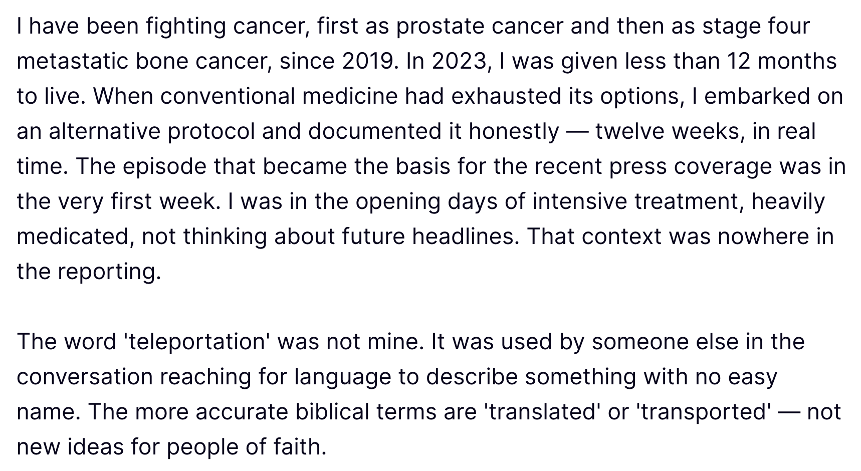 In case that's hard to see on your screen, he wrote, "I have been fighting cancer, first as prostate cancer and then as stage four metastatic bone cancer, since 2019. In 2023, I was given less than 12 months to live. When conventional medicine had exhausted its options, I embarked on an alternative protocol and documented it honestly — twelve weeks, in real time. The episode that became the basis for the recent press coverage was in the very first week. I was in the opening days of intensive treatment, heavily medicated, not thinking about future headlines. That context was nowhere in the reporting.