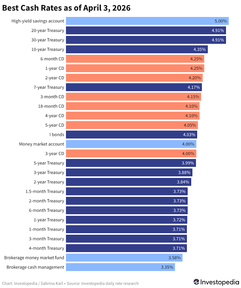 Top high-yield savings accounts still pay up to 5.00% with certain requirements, or up to 4.60% with no strings attached. The best nationwide CD rate is 4.25%, while brokerages, robo-advisors, and Treasurys offer returns ranging from the mid-3% to upper-4% range.