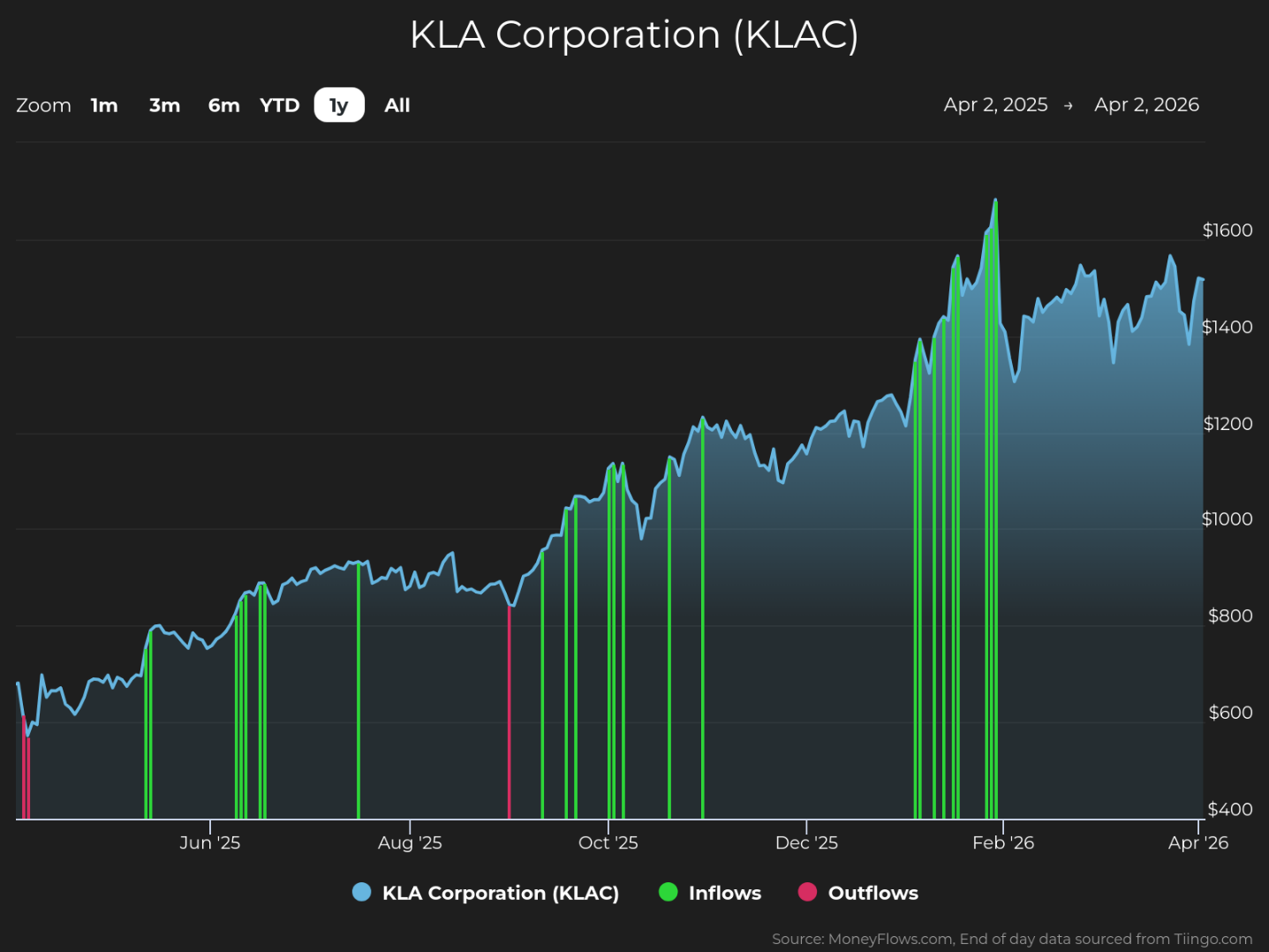 KLAC supplies process control and yield management solutions for the semiconductor and related nano-electronics industries. The company’s second-quarter fiscal 2026 earnings report showed annual revenue of $12.745 billion (a 17% year-over-year jump), annual GAAP diluted per-share earnings of $8.68 (29% year-over-year growth), along with quarterly revenue and GAAP EPS midpoint guidance of $3.35 billion and $8.85, respectively. The company reports next on April 23. It’s no wonder KLAC shares are up 25% so far this year – and they could rise more. MoneyFlows data shows how Big Money investors are again betting heavily on the stock. Institutional volumes reveal plenty. In the last year, KLAC has enjoyed strong investor demand, which we believe to be institutional support. Each green bar signals unusually large volumes in KLAC shares. They reflect our proprietary inflow signal, pushing the stock higher: Plenty of technology names are under accumulation right now. But there’s a powerful fundamental story happening with KLA. Institutional support and a healthy fundamental backdrop make this company worth investigating. As you can see, KLAC has had strong sales and earnings growth: 3-year sales growth rate (+10.5%) 3-year EPS growth rate (+14.6%) Source: FactSet Also, EPS is estimated to ramp higher this year by +30.9%. Now it makes sense why the stock has been generating Big Money interest. KLAC has a track record of strong financial performance. Marrying great fundamentals with MoneyFlows software has found some big winning stocks over the long term. KLA has been a top-rated stock at MoneyFlows for years. That means the stock has unusual buy pressure and growing fundamentals. We have a ranking process that showcases stocks like this on a weekly basis. It’s garnered five outlier inflow signals in the last year and 23 in the last three years. The blue bars below show when KLAC was a top pick on the Outlier 20 report…institutional support matters: Tracking unusual volumes reveals the power of money flows. This is a trait that most outlier stocks exhibit…the best of the best. Big Money demand drives stocks upward. The KLAC action isn’t new at all. Big Money buying in the shares is signaling to take notice. Given the historical gains in share price and strong fundamentals, this stock could be worth a spot in a diversified portfolio. Disclosure: the author holds no position in KLAC at the time of publication. If you are a Registered Investment Advisor (RIA) or are a serious investor, take your investing to the next level and follow our free weekly MoneyFlows insights. This article was originally posted on FX Empire Gold and the Dollar Down as Central Banks Ready to Pivot See The Power of Institutions on nVent Growth GE Vernova Growing with Institutional Buys Rate Hike Fails to Lift Aussie as RBA’s 5–4 Split Felt Like a Hold Further Strength for the Dollar Ahead of the NFP Beyond Data, Western Digital Stores Institutional Capital