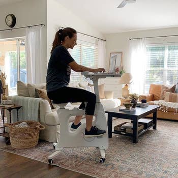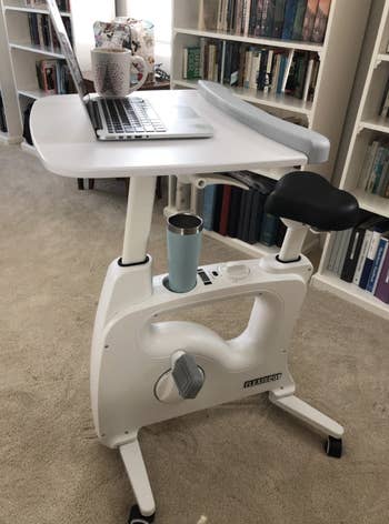 Promising review: "First, it's SO easy to assemble. The legs and wheels snap right into place, and the only other thing you need to do is plop the desk on top of the desk and connect it with a screw. BAM. It took less than five minutes. I honestly want to rip the seat off and put it on my own bicycle because it's so comfortable. It's a plushy seat that adds tons of comfort and support. I LOVE how easy and self-explanatory the bike is, as well as how PORTABLE it is. The wheels make it super easy to move. The desk is a dream come true — nice and spacious, and I love the plush armrest that sits along the edge. If I could give this product 100 STARS, I would! For the amount of HOURS I spend sitting at a computer a day, this has been an absolute LIFESAVER, and I highly recommend it to anyone who wishes they could not only be more active but also have better posture while working at their computer. Sometimes I just sit on the bike to do my work because of how wonderful it is!" —Alexa Chalnick