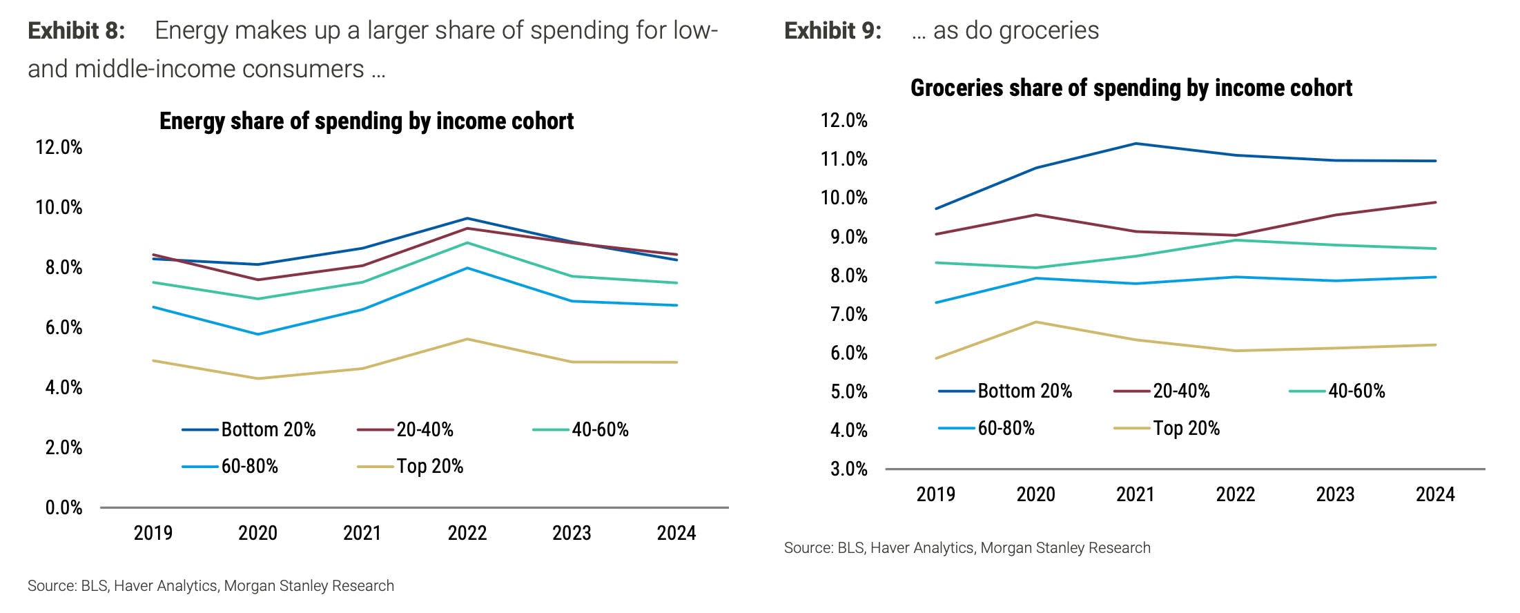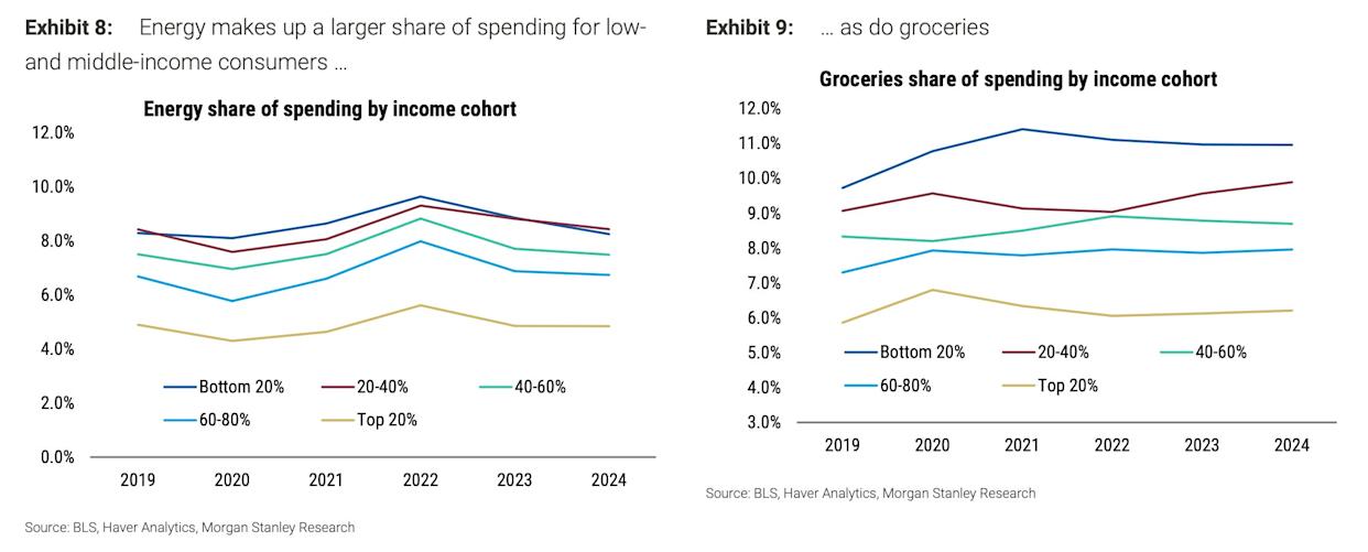 "For low-income consumers, spending on essentials, including energy and food, is a larger share of both their total spending and their income," Morgan Stanley economists wrote last month. "As of the most recent Consumer Expenditure Survey from 2024, energy spend made up 8.2% of total spending for the bottom 20% income cohort compared to 4.8% for the top. Limiting to just gasoline, gas made up 3.6% for the bottom cohort versus 2.6% for the top."