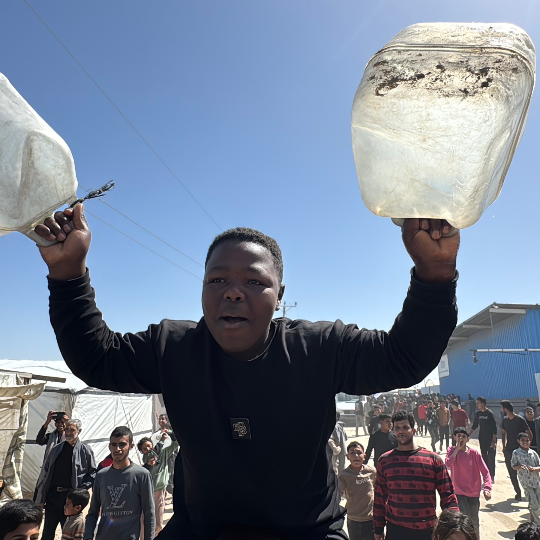 Nawaf explains that he can barely fill two small jerrycans due to the overwhelming crowd and intense competition among displaced people to access the filling stations.
